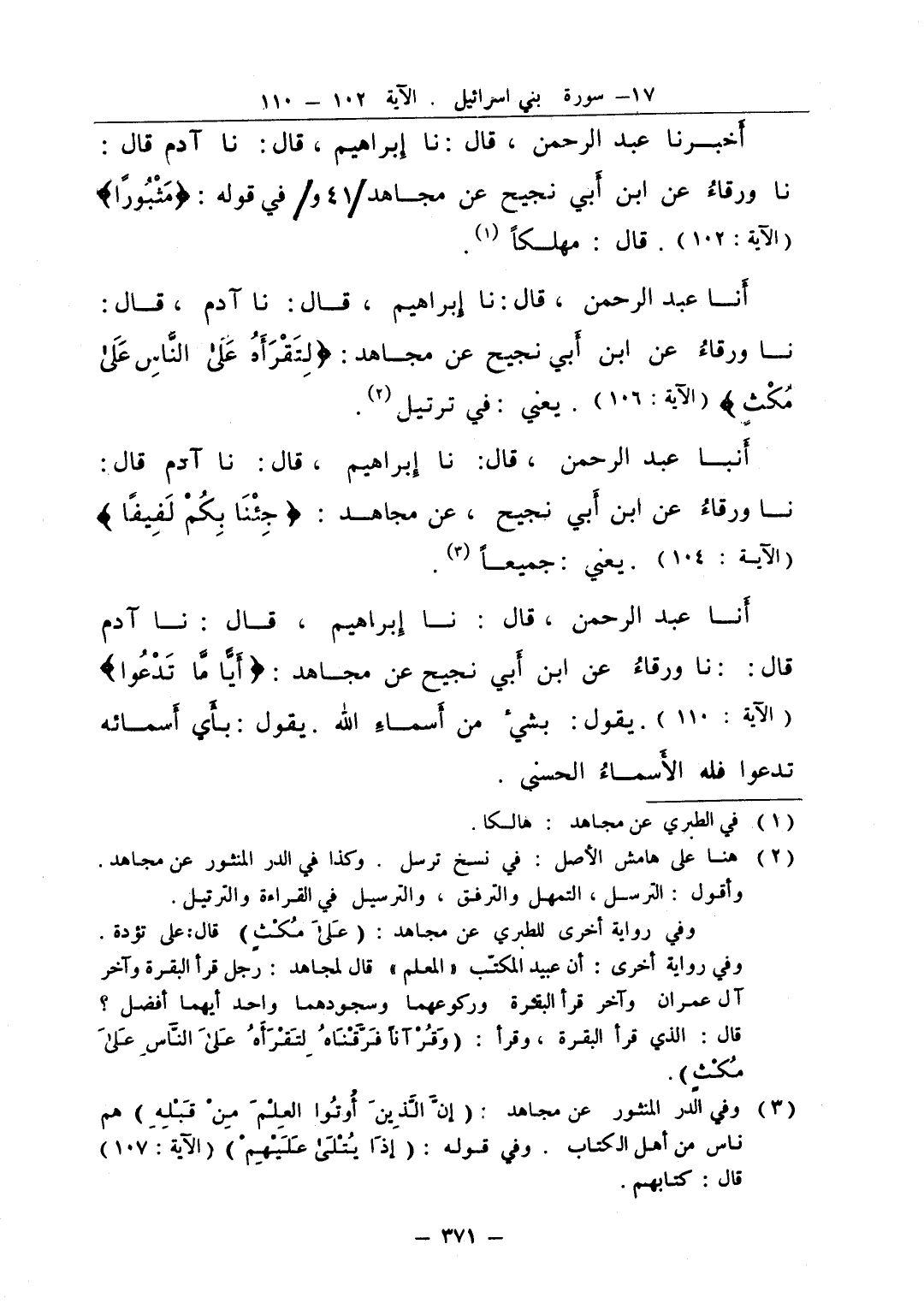 أنا عبد الرحمن قال نا إبراهيم قال نا آدم قال نا ورقاء عن ابن أبي نجيح عن مجاهد تقرأه على الناس على مكث يعني في ترتيل