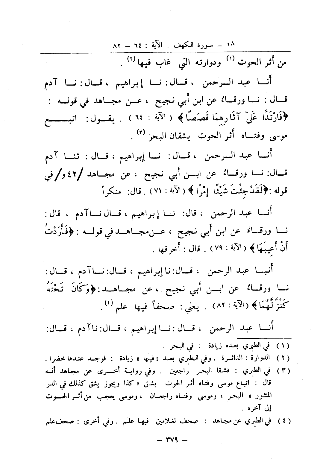 أنا عبد الرحمن قال نا إبراهيم قال نا آدم قال نا ورقاء عن ابن ابي نجيح عن مجاهد في قوله فارتدا على آثارهما قصصا يقول اتبع موسى وفتاه أثر الحوت يشقان البحر