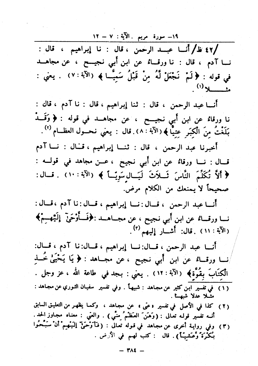 أخبرنا عبد الرحمن قال ثنا إبراهيم قال نا آدم قال نا ورقاء عن ابن أبي نجيح عن مجاهد في قوله الا تكلم الناس ثلاث ليال سويا قال صحيحا لا يمنعك من الكلام مرض