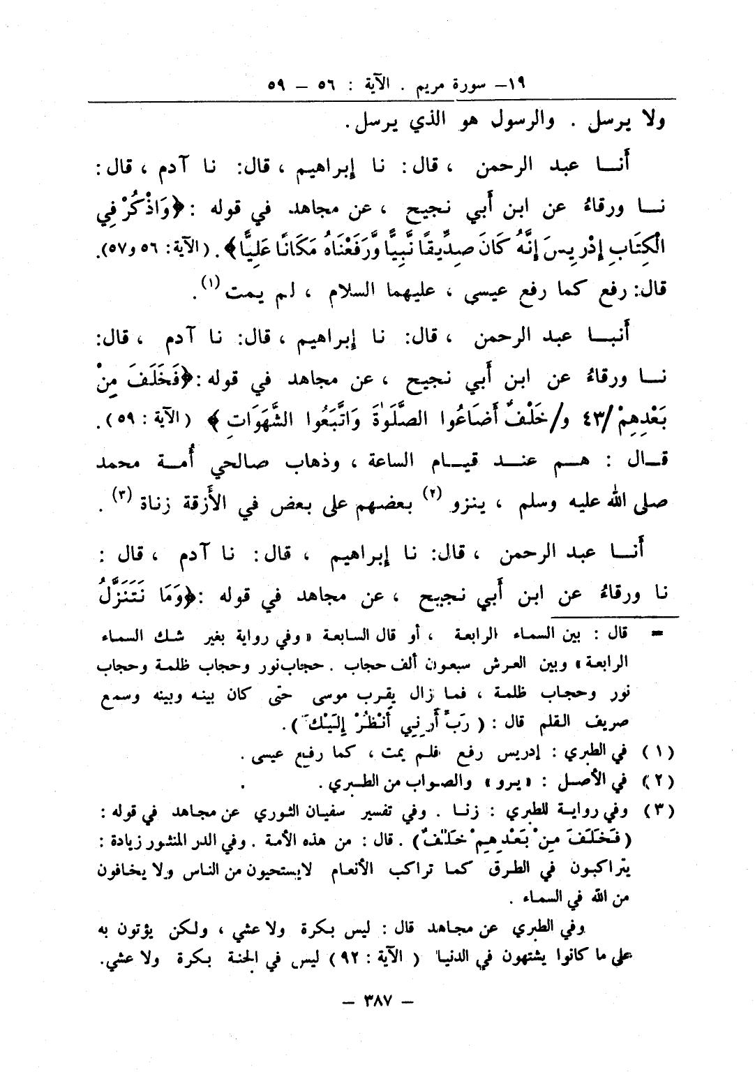 أنا عبد الرحمن قال نا إبراهيم قال نا آدم قال نا ورقاء عن ابن ابي نجيح عن مجاهد في قوله واذكر في الكتاب إدريس إنه كان صديقا نبيا ورفعناه مكانا عليا قال رفع كما رفع عيسى عليهما السلام لم يمت