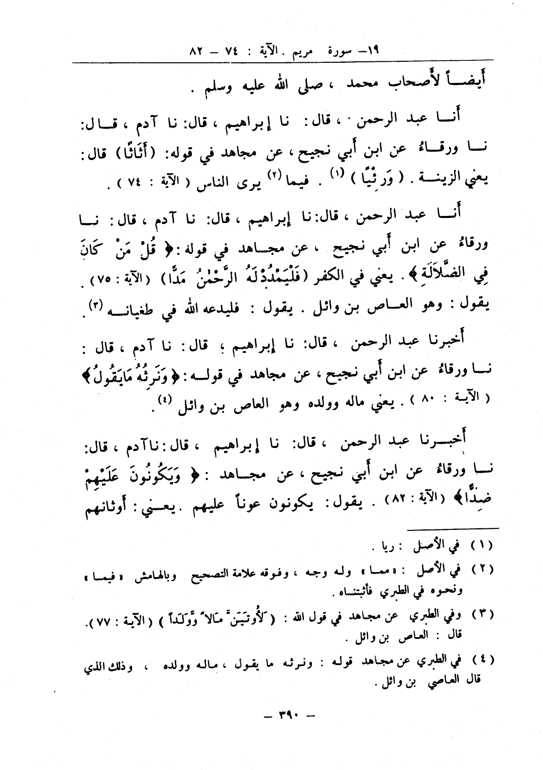 أخبرنا عبد الرحمن قال نا إبراهيم قال نا آدم قال نا ورقاء عن ابن أبي نجيح عن مجاهد في قوله ونرثه ما يقول يعني ماله وولده وهو العاص بن وائل