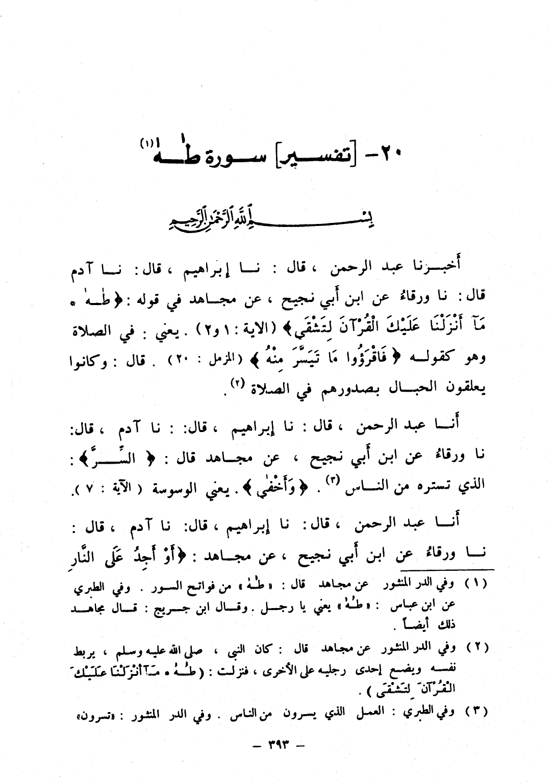 أخبرنا عبد الرحمن قال نا إبراهيم قال نا آدم قال نا ورقاء عن ابن أبي نجيح عن مجاهد في قوله طه ما أنزلنا عليك القرآن لتشقى يعني في الصلاة وهو كقوله فاقرؤوا ما تيسر منه قال وكانوا يعلقون الحبال بصدوره في الصلاة