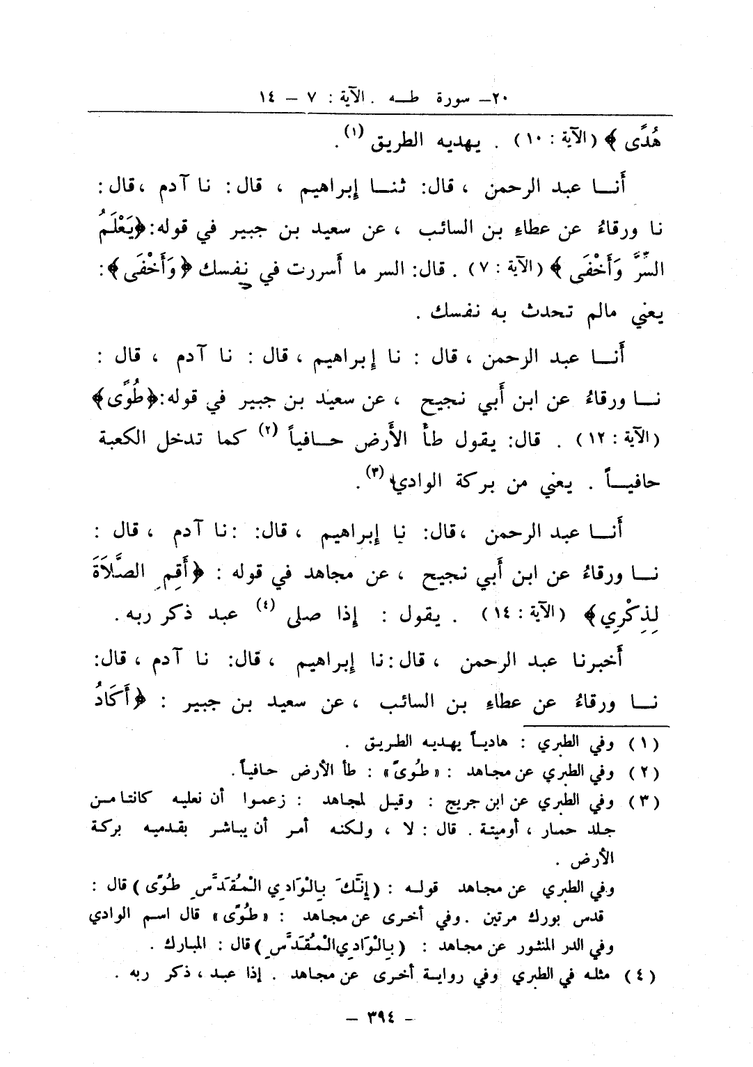 انا عبد الرحمن قال نا إبراهيم قال نا آدم قال نا ورقاء عن ابن أبي نجيح عن سعيد بن جبير في قوله طوى قال يقول طأ الأرض حافيا كما تدخل الكعبة حافيا يعني من بركة الوادي