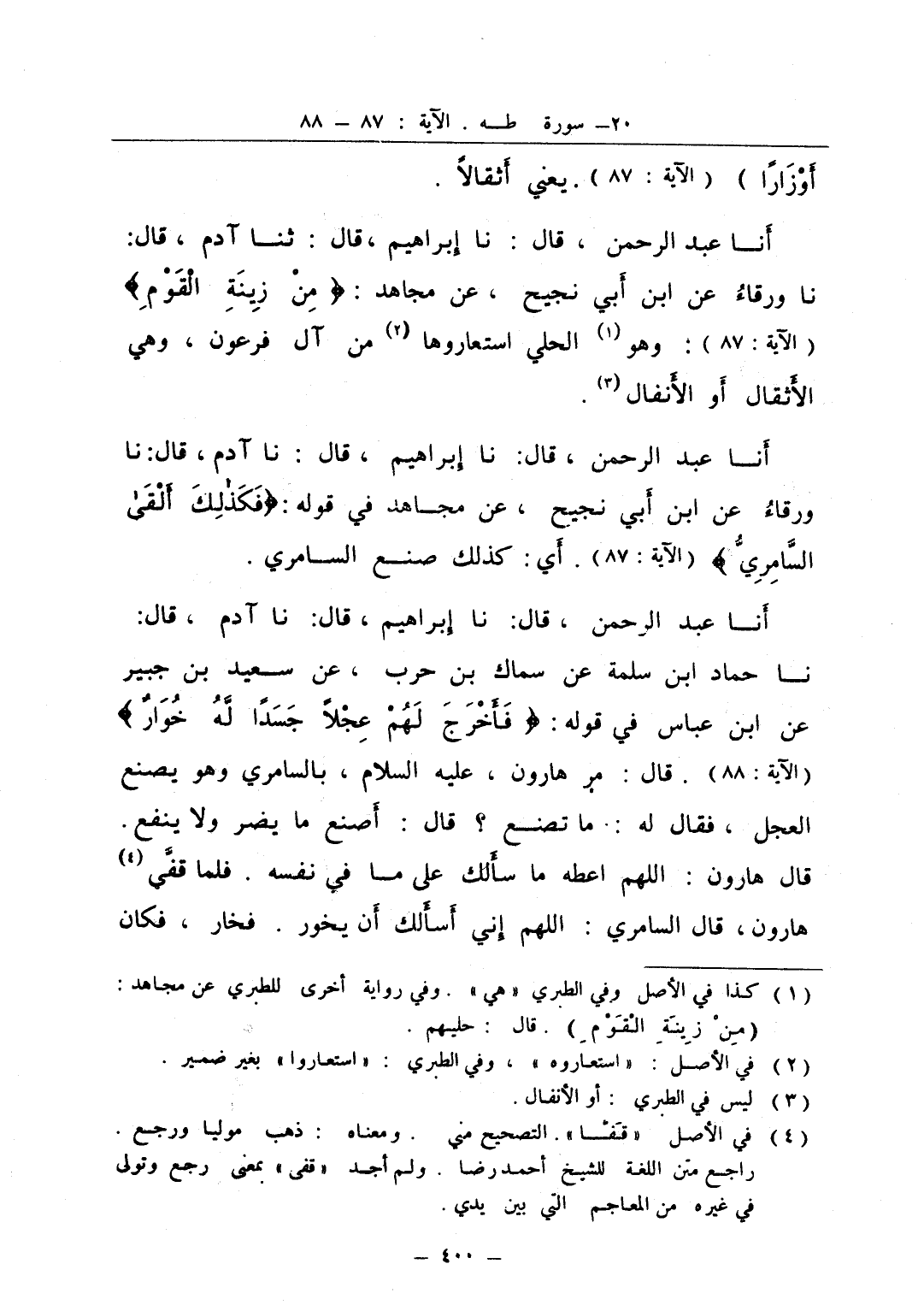 أنا عبد الرحمن قال نا إبراهيم قال ثنا آدم قال نا ورقاء عن ابن أبي نجيح عن مجاهد من زينة القوم وهو الحلي استعاروها من آل فرعون وهي الأثقال أو الأنفال