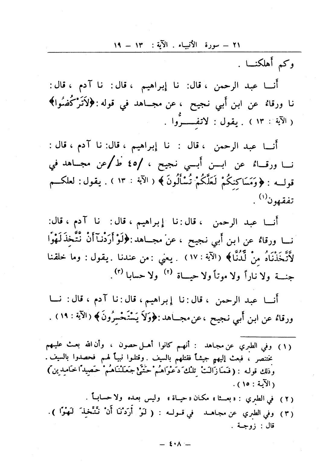 انا عبد الرحمن قال نا إبراهيم قال نا آدم قال نا ورقاء عن ابن أبي نجيح عن مجاهد في قوله لا تركضوا يقول لا تفروا