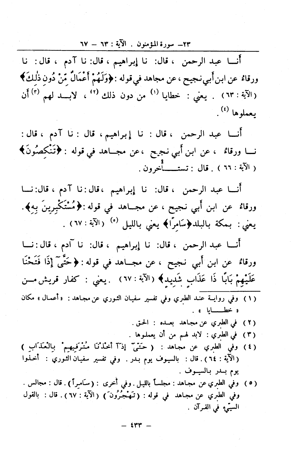 انا عبد الرحمن قال نا إبراهيم قال نا آدم قال نا ورقاء عن ابن أبي نجيح عن مجاهد في قوله مستكبرين به يعني بمكة بالبلد سامرا يعني بالليل 5