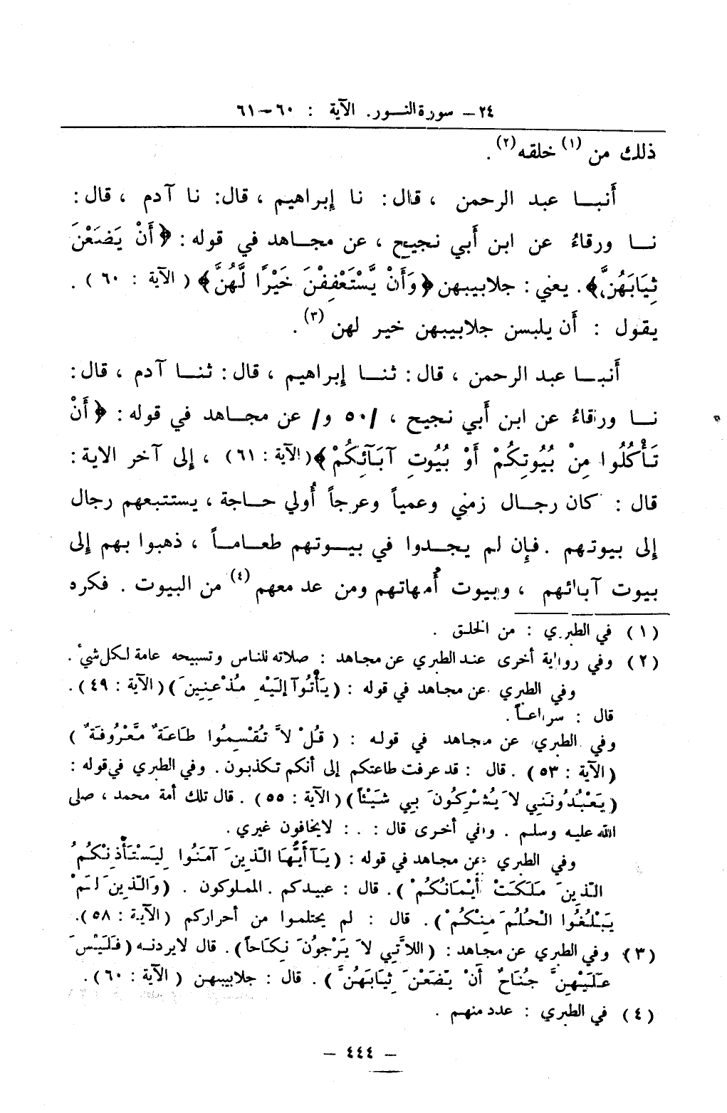 أنبا عبد الرحمن قال نا إبراهيم قال نا آدم قال نا ورقاء عن ابن أبي نجيح عن مجاهد في قوله أن يضعن ثيابهن يعني جلابيبهن وأن يستعففن خيرا لهن يقول أن يلبسن جلابيبهن خير لهن 3