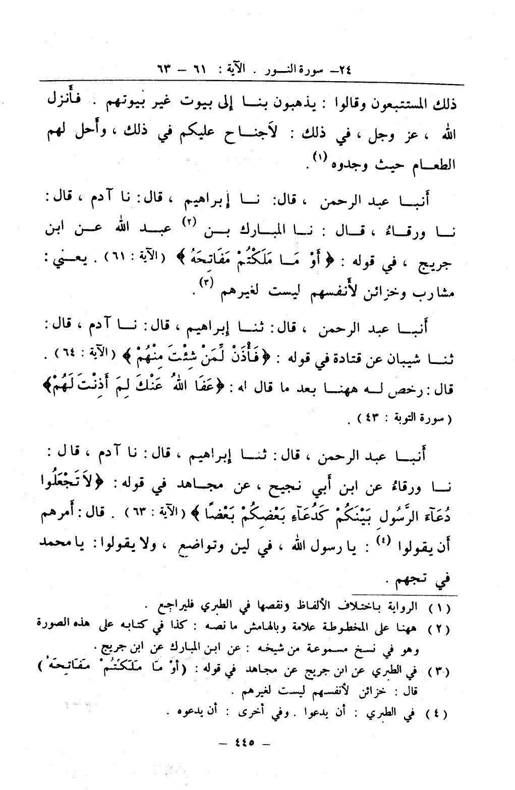أنبا عبد الرحمن قال نا إبراهيم قال نا آدم قال نا ورقاء قال نا المبارك بن 2 عبد الله عن ابن جريج في قوله أو ما ملكتم مفاتحه يعني مشارب وخزائن لأنفسهم ليست لغيرهم 3