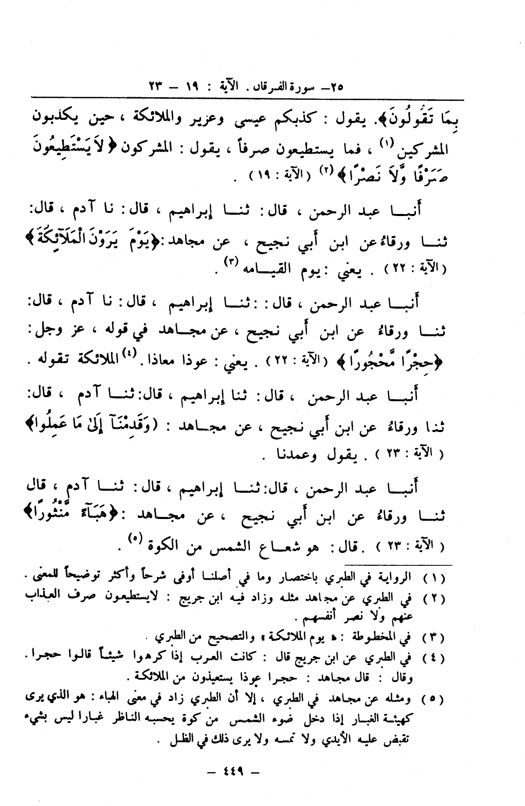 انبا عبد الرحمن قال ثنا إبراهيم قال نا آدم قال ثنا ورقاء عن ابن أبي نجيح عن مجاهد يوم يرون الملآئكة يعني يوم القيامة 3