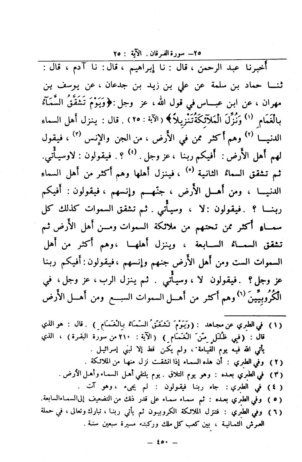 أخبرنا عبد الرحمن قال نا إبراهيم قال نا آدم قال ثنا حماد بن سلمة عن علي بن زيد بن جدعان عن يوسف بن مهران عن ابن عباس في قول الله عز و جل ويوم تشقق السمآء بالغمام 1 ونزل الملآئكة تنزيلا قال ينزل أهل السماء الدنيا 2 وهم أكثر ممن في الأرض من الجن والإنس 3 فيقول لهم أهل الأرض أفيكم ربنا عز و جل 4 فيقولون لا وسيأتي ثم تشقق السماء الثانية 5 فينزل أهلها وهم أكثر من أهل السماء الدنيا ومن أهل الأرض جنهم وإنسهم فيقولون أفيكم ربنا فيقولون لا وسيأتي ثم تشقق السموات كذلك كل سماء أكثر ممن تحتهم من ملائكة السموات ومن أهل الأرض ثم تشقق السماء السابعة وينزل أهلها وهم أكثر من أهل السموات الست ومن أهل الأرض جنهم وإنسهم فيقولون أفيكم ربنا عز و جل فيقولون لا وسيأتي ثم ينزل الرب عز و جل في الكروبيين 6 وهم أكثر من أهل السموات السبع ومن أهل الأرض