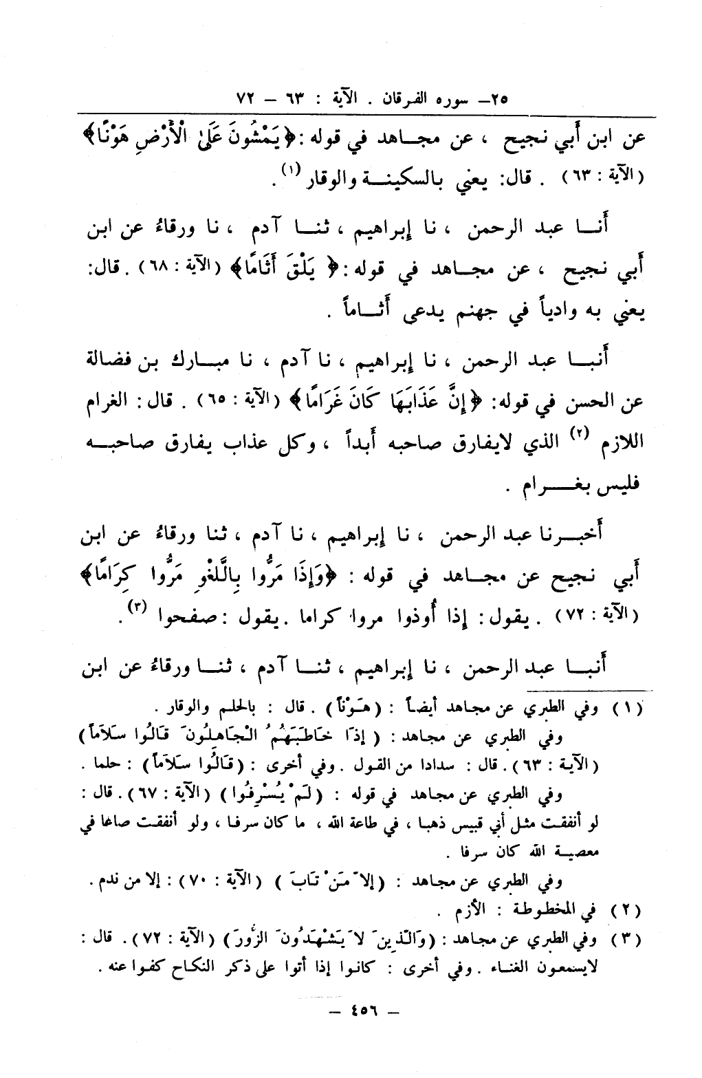 أخبرنا عبد الرحمن نا إبراهيم نا آدم ثنا ورقاء عن ابن أبي نجيح عن مجاهد في قوله وإذا مروا باللغو مروا كراما يقول إذا أوذوا مروا كراما يقول صفحوا 3