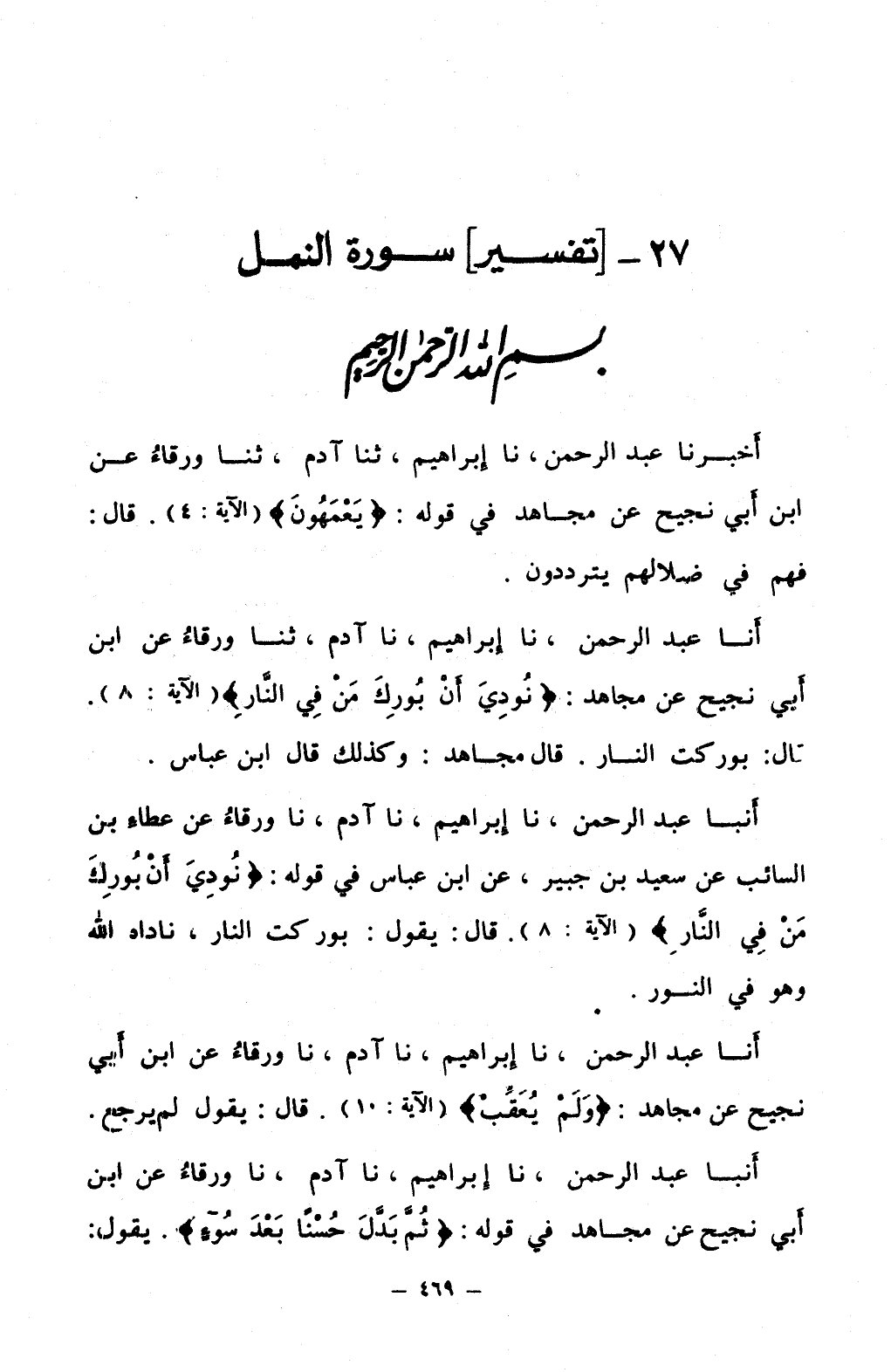 أنا عبد الرحمن نا إبراهيم نا آدم ثنا ورقاء عن ابن أبي نجيح عن مجاهد نودي أن بورك من في النار قال بوركت النار قال مجاهد وكذلك قال ابن عباس