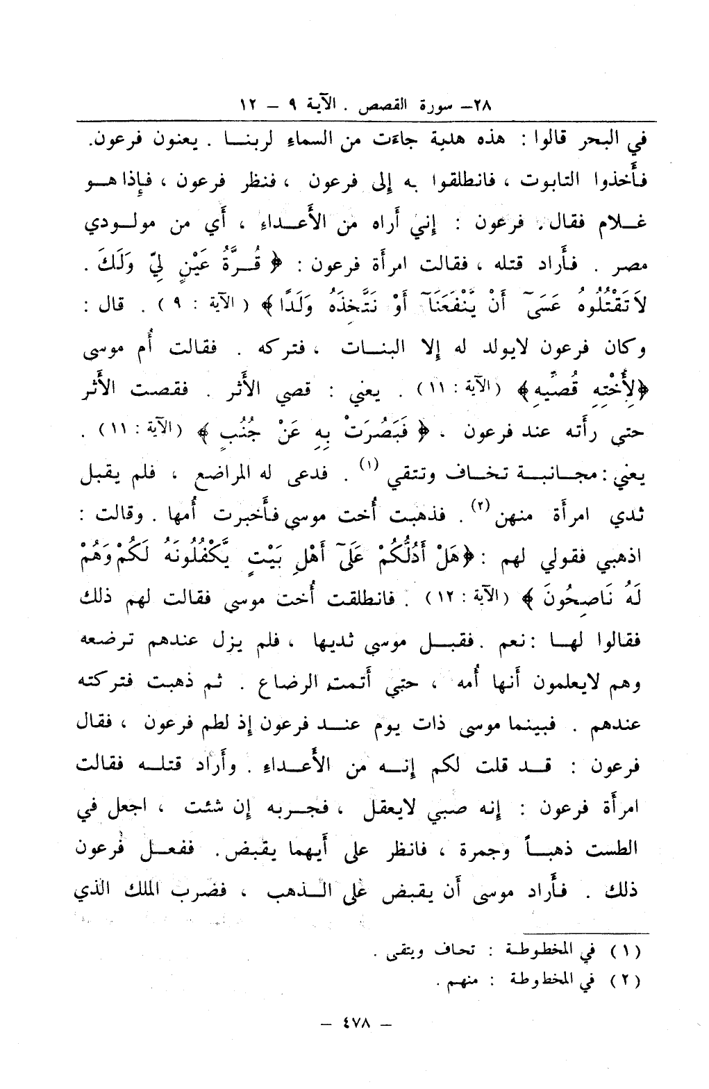 في البحر قالوا هذه هدية جاءت من السماء لربنا يعنون فرعون فأخذوا التابوت فانطلقوا به إلى فرعون فنظر فرعون فإذا هو غلام فقال فرعون إني أراه من الأعداء أي من مولودي مصر فأراد قتله فقالت امرأة فرعون قرة عين لي ولك لا تقتلوه عسى أن ينفعنا أو نتخذه ولدا قال وكان فرعون لا يولد له إلا البنات فتركه فقالت أم موسى لأخته قصية يعني قصي الأثر فقصت الأثر حتى رأته عند فرعون فبصرت به عن جنب يعني مجانبة تخاف وتتقي 1 فدعى له المراضع فلم يقبل ثدي امرأة منهن 2 فذهبت أخت موسى فأخبرت أمها وقالت اذهبي فقولي لهم هل أدلكم على أهل بيت يكفلونه لكم وهم له ناصحون فانطلقت أخت موسى فقالت لهم ذلك فقالوا لها نعم فقبل موسى ثديها فلم يزل عندهم ترضعه وهم لا يعلمون أنها أمه حتى أتمت الرضاع ثم ذهبت فتركته عندهم فبينما موسى ذات يوم عند فرعون إذ لطم فرعون فقال فرعون قد قلت لكم إنه من الأعداء وأراد قتله فقالت امرأة فرعون إنه صبي لا يعقل فجربه إن شئت اجعل في الطست ذهبا وجمرة فانظر على أيهما يقبض ففعل فرعون ذلك فأراد موسى أن يقبض على الذهب فضرب الملك الذي