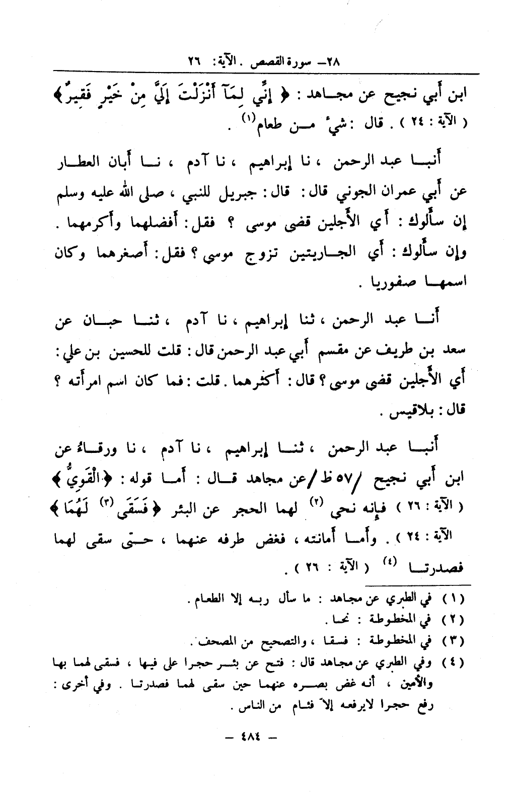 انبا عبد الرحمن ثنا إبراهيم نا آدم نا ورقاء عن ابن أبي نجيح عن مجاهد قال أما قوله القوي فإنه نحى 2 لهما الحجر عن البئر فسقى 3 لهما وأما أمانته فغض طرفه عنهما حتى سقى لهما فصدرتا 4