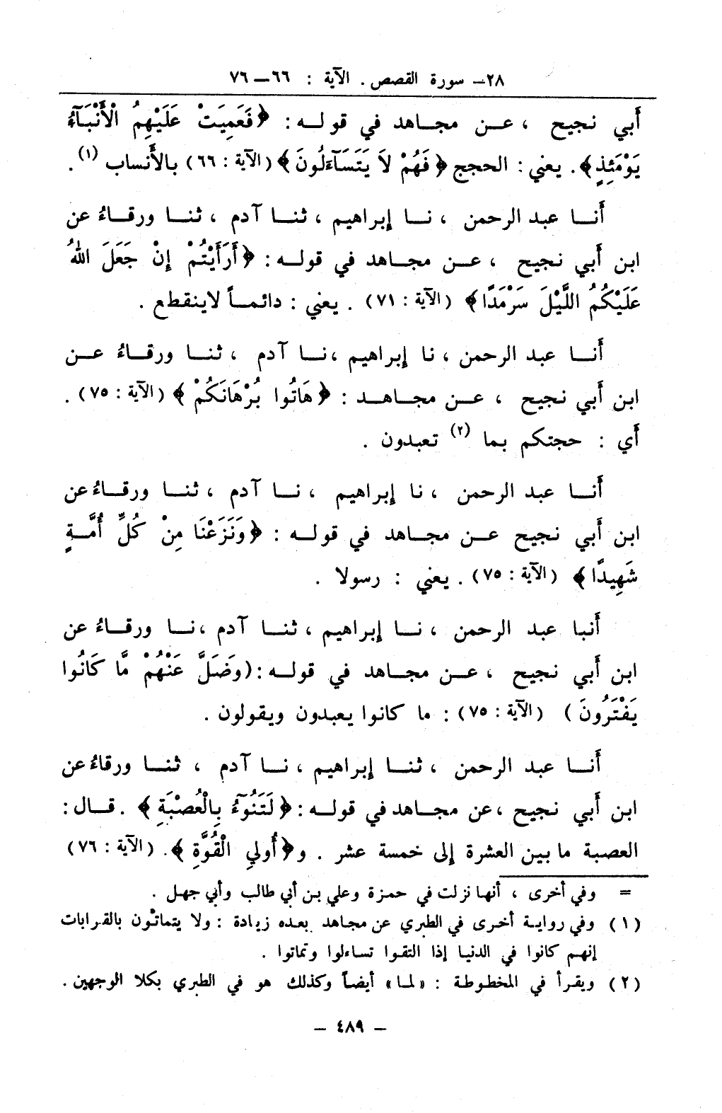 أنا عبد الرحمن ثنا إبراهيم نا آدم ثنا ورقاء عن ابن أبي نجيح عن مجاهد في قوله لتنوء بالعصبة قال العصبة ما بين العشرة إلى خمسة عشر وأولي القوة