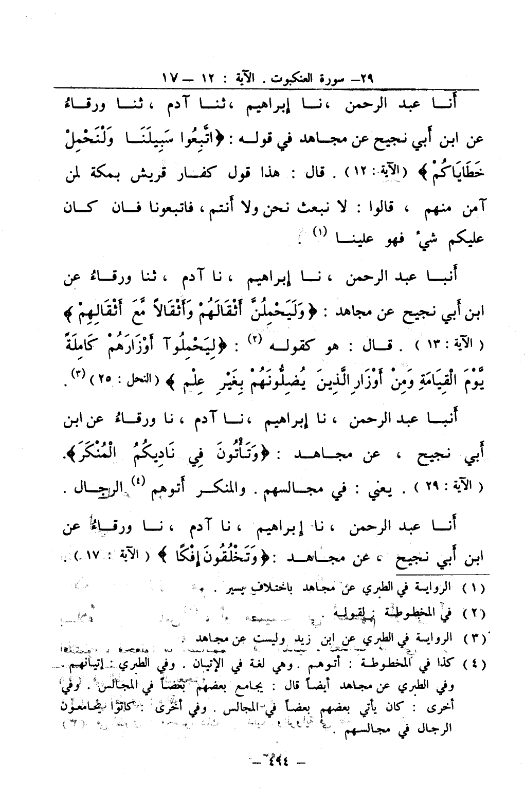 انبا عبد الرحمن نا إبراهيم نا آدم ثنا ورقاء عن ابن أبي نجيح عن مجاهد وليحملن أثقالهم وأثقالا مع أثقالهم قال هو كقوله 2 ليحملوا أوزارهم كاملة يوم القيامة ومن أوزار الذين يضلونهم بغير علم 3