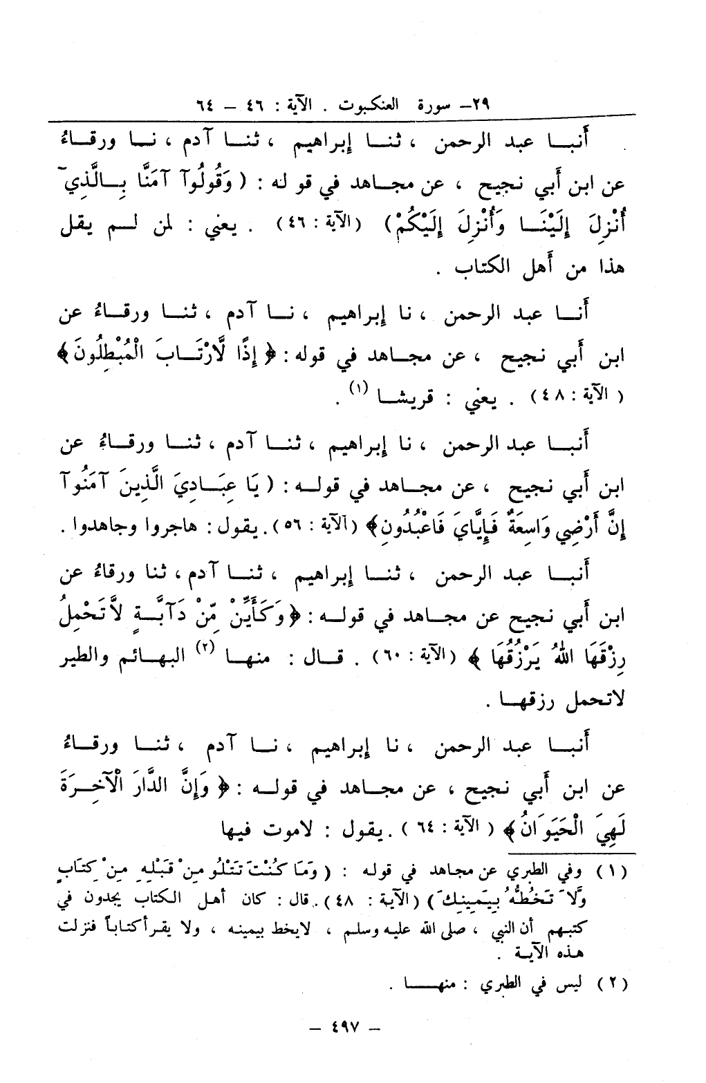 انبا عبد الرحمن نا إبراهيم ثنا آدم ثنا ورقاء عن ابن أبي نجيح عن مجاهد في قوله يا عبادي الذين آمنوآ إن أرضي واسعة فإياي فاعبدون يقول هاجروا وجاهدوا