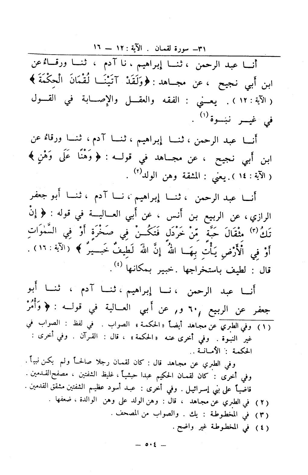 أنا عبد الرحمن ثنا إبراهيم نا آدم ثنا ورقاء عن ابن أبي نجيح عن مجاهد ولقد آتينا لقمان الحكمة يعني الفقه والعقل والإصابة في القول في غير نبوة 1