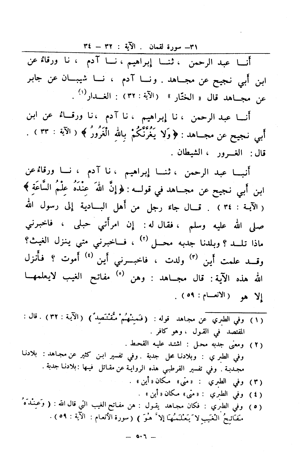 أنبا عبد الرحمن ثنا إبراهيم نا آدم نا ورقاء عن ابن أبي نجيح عن مجاهد في قوله إن الله عنده علم الساعة قال جاء رجل من أهل البادية إلى رسول الله صلى الله عليه و سلم فقال له إن امرأتي حبلى فاخبرني ماذا تلد وبلدنا جدبه محل 2 فأخبرني متى ينزل الغيث وقد علمت أين 3 ولدت فأخبرني أين 4 أموت فأنزل الله هذه الآية قال مجاهد وهن 5 مفاتح الغيب لا يعلمها إلا هو
