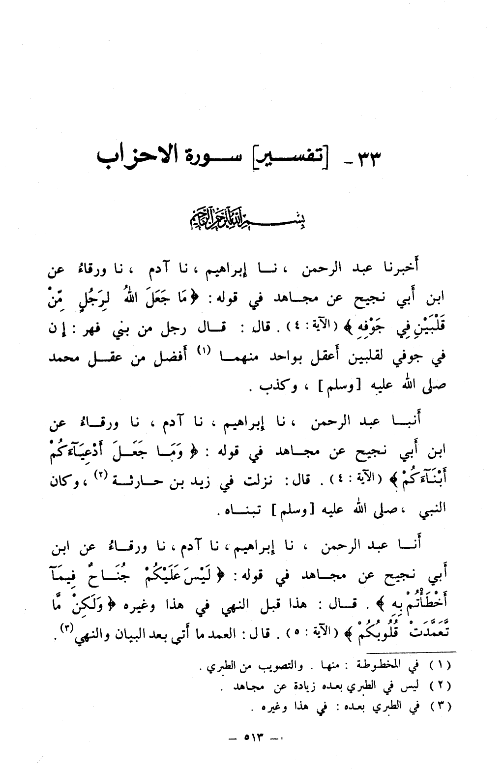 أنبا عبد الرحمن نا إبراهيم نا آدم نا ورقاء عن ابن أبي نجيح عن مجاهد في قوله وما جعل أدعيآءكم أبنآءكم قال نزلت في زيد بن حارثة 2 وكان النبي صلى الله عليه و سلم تبناه