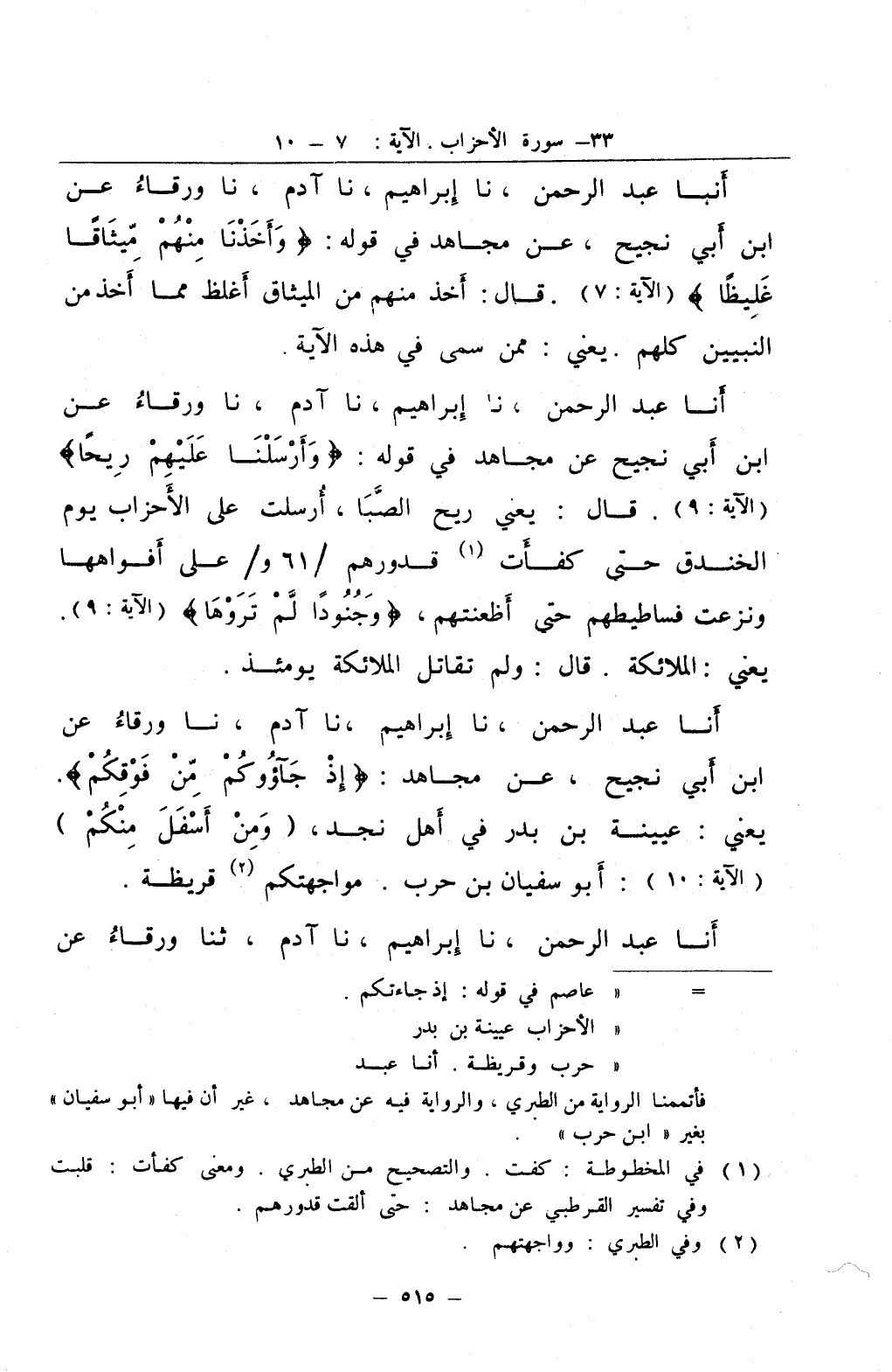 أنا عبد الرحمن نا إبراهيم نا آدم نا ورقاء عن ابن أبي نجيح عن مجاهد إذ جآؤوكم من فوقكم يعني عيينة بن بدر في أهل نجد ومن اسفل منكم أبو سفيان بن حرب مواجهتكم 2 قريظة