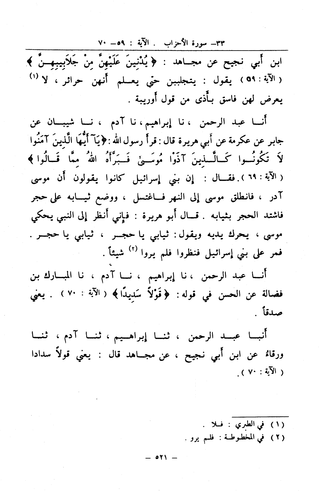 أنا عبد الرحمن نا إبراهيم نا آدم نا شيبان عن جابر عن عكرمة عن أبي هريرة قال قرأ رسول الله يآ أيها الذين آمنوا لا تكونوا كالذين آذوا موسى فبرأه الله مما قالوا فقال إن بني إسرائيل كانوا يقولون أن موسى آدر فانطلق موسى إلى النهر فاغتسل ووضع ثيابه على حجر فاشتد الحجر بثيابه قال أبو هريرة فإني أنظر إلى النبي يحكي موسى يحرك يديه ويقول ثيابي يا حجر ثيابي يا حجر فمر على بني إسرائيل فنظروا فلم يرو 2 شيئا