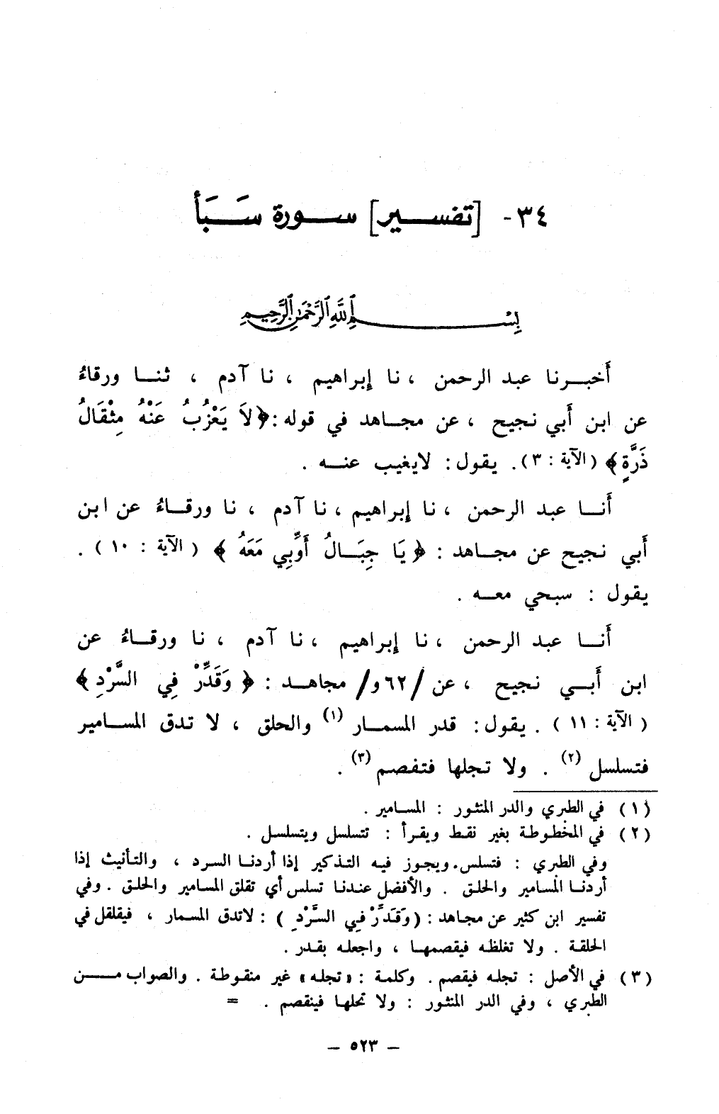 أنا عبد الرحمن نا إبراهيم نا آدم نا ورقاء عن ابن أبي نجيح عن مجاهد وقدر في السرد يقول قدر المسمار 1 والحلق لا تدق المسامير فتسلسل 2 ولا تجلها فتفصم 3