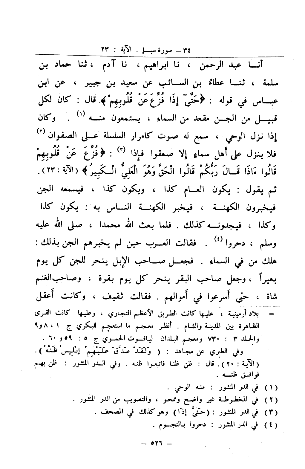 أنا عبد الرحمن نا إبراهيم نا آدم ثنا حماد بن سلمة ثنا عطاء بن السائب عن سعيد بن جبير عن ابن عباس في قوله حتى إذا فزع عن قلوبهم قال كان لكل قبيل من الجن مقعد من السماء يستمعون منه 1 وكان إذا نزل الوحي سمع له صوت كامرار السلسلة على الصفوان 2 فلا ينزل على أهل سماء إلا صعقوا فإذا 3 فزع عن قلوبهم قالوا ماذا قال ربكم قالوا الحق وهو العلي الكبير ثم يقول يكون العام كذا ويكون كذا فيسمعه الجن فيخبرون الكهنة فيخبر الكهنة الناس به يكون كذا وكذا فيجدونه كذلك فلما بعث الله محمد صلى الله عليه و سلم دحروا 4 فقالت العرب حين لم يخبرهم الجن بذلك هلك من في السماء فجعل صاحب الإبل ينحر للجن كل يوم بعيرا وجعل صاحب البقر ينحر كل يوم بقرة وصاحب الغنم شاة حتى اسرعوا في أموالهم فقالت ثقيف وكانت أعقل
