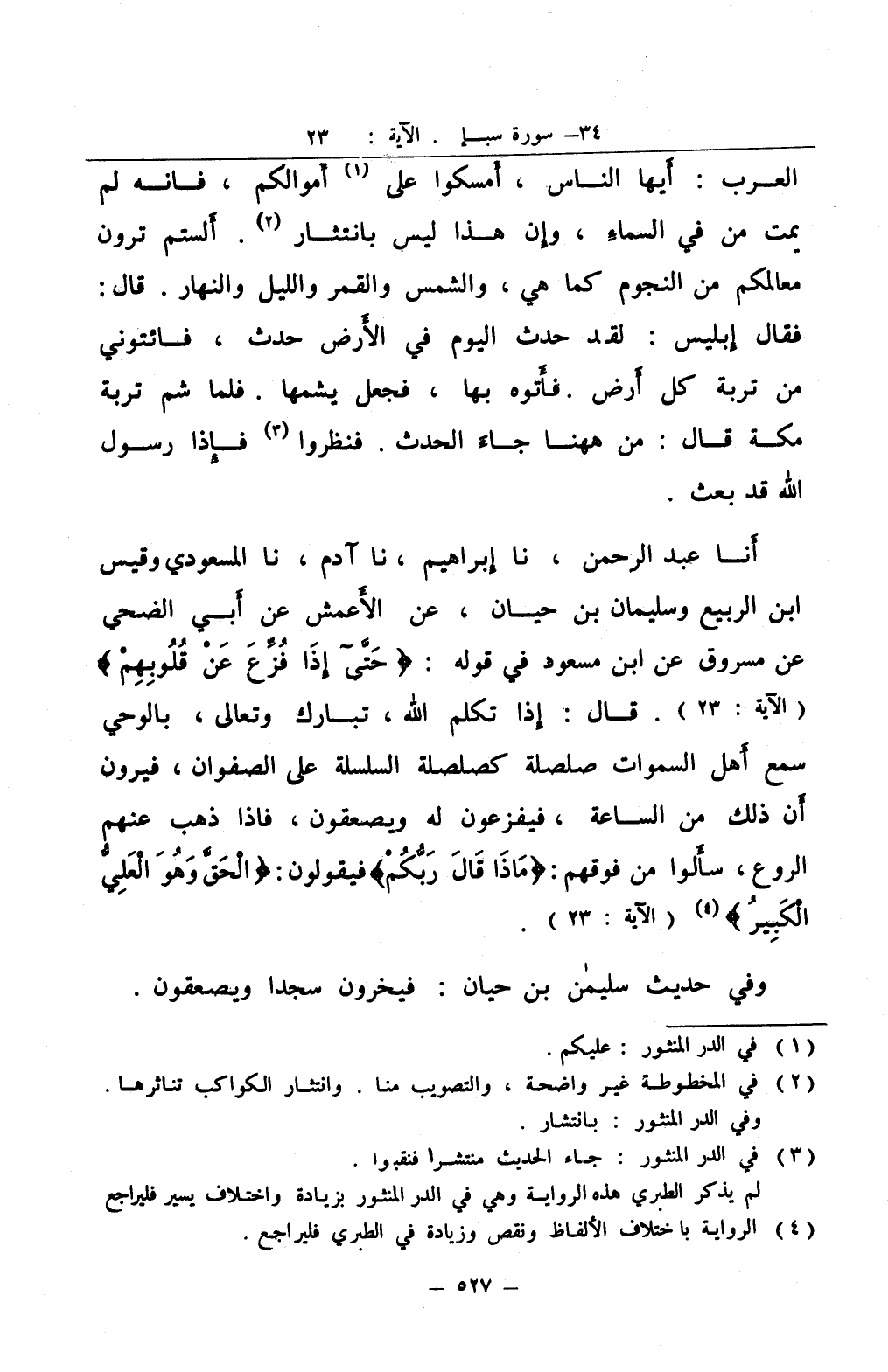 أنا عبد الرحمن نا إبراهيم نا آدم نا المسعودي وقيس ابن الربيع وسليمان بن حيان عن الأعمش عن أبي الضحى عن مسروق عن ابن مسعود في قوله حتى إذا فزع عن قلوبهم قال إذا تكلم الله تبارك وتعالى بالوحي سمع أهل السموات صلصلة كصلصلة السلسلة على الصفوان فيرون أن ذلك من الساعة فيفزعون له ويصعقون فإذا ذهب عنهم الروع سألوا من فوقهم ماذا قال ربكم فيقولون الحق وهو العلي الكبير 4