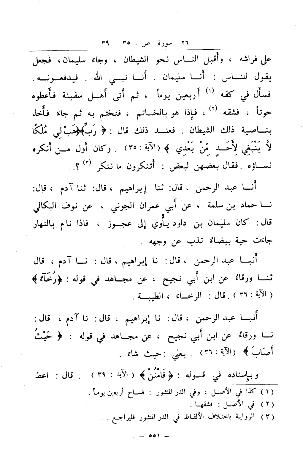 أنا عبد الرحمن قال ثنا إبراهيم قال ثنا آدم قال نا حماد بن سلمة عن أبي عمران الجوني عن نوف البكالي قال كان سليمان بن داود يأوي إلى عجوز فاذا نام بالنهار جاءت حية بيضاء تذب عن وجهه