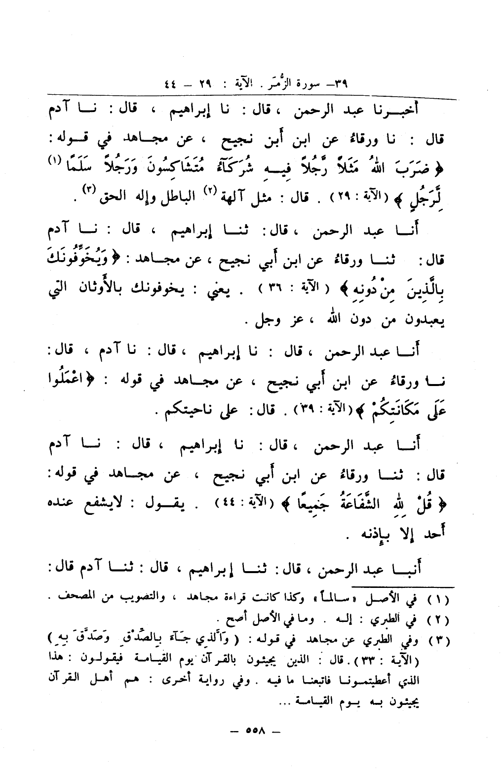 أخبرنا عبد الرحمن قال نا إبراهيم قال نا آدم قال نا ورقاء عن ابن أبي نجيح عن مجاهد في قوله ضرب الله مثلا رجلا فيه شركآء متشاكسون ورجلا سلما لرجل قال مثل آلهة الباطل وإله الحق