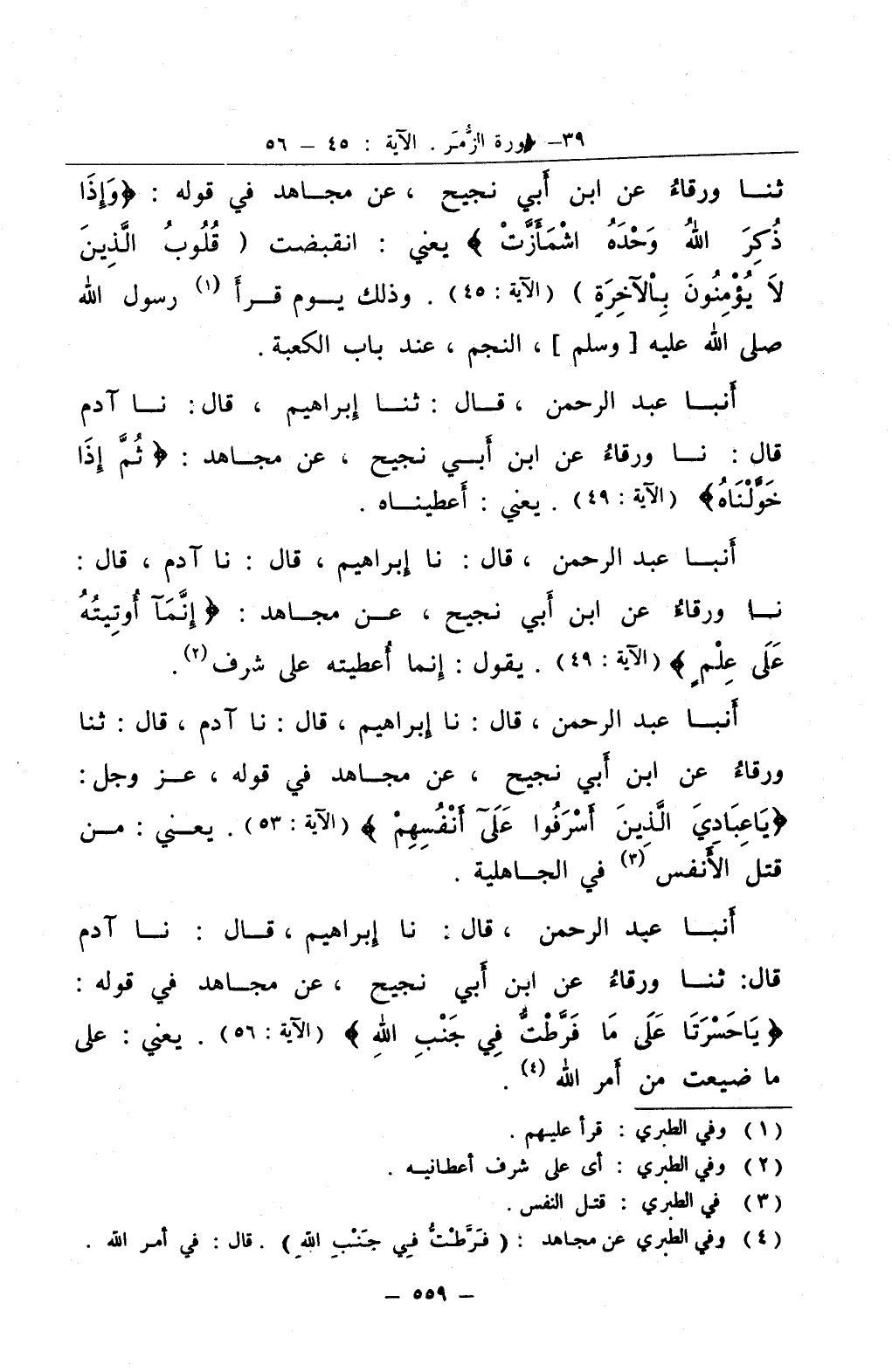 أنبا عبد الرحمن قال نا إبراهيم قال نا آدم قال ثنا ورقاء عن ابن أبي نجيح عن مجاهد في قوله عز و جل يا عبادي الذين أسرفوا على أنفسهم يعني من قتل الأنفس في الجاهلية