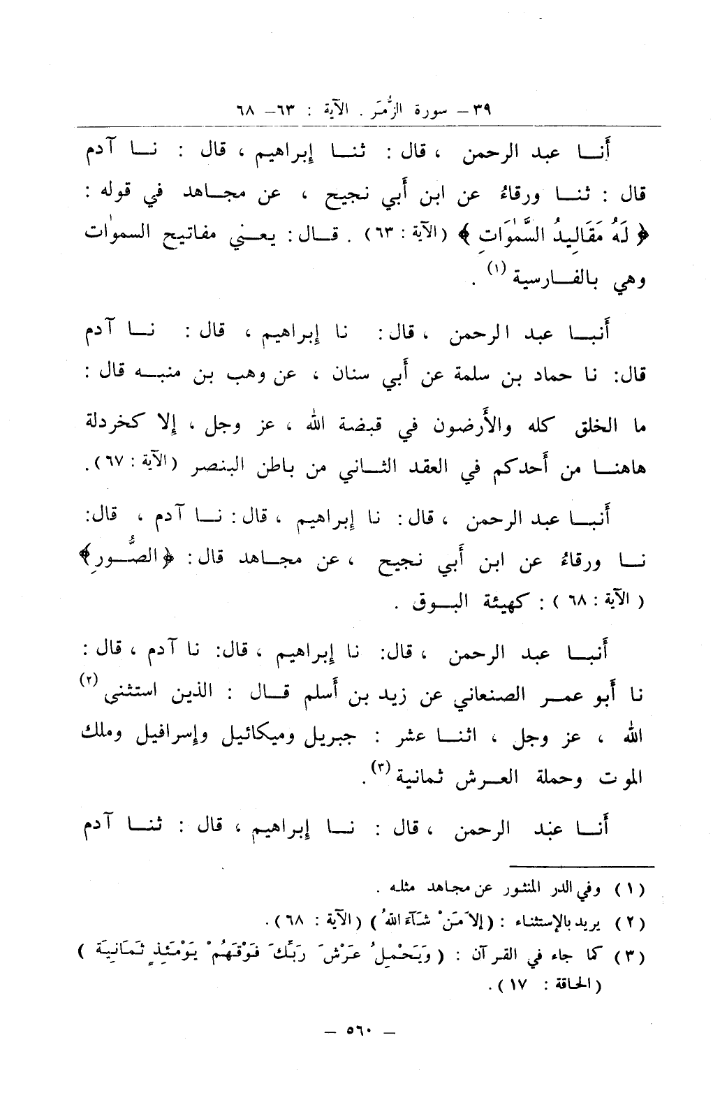أنبا عبد الرحمن قال نا إبراهيم قال نا آدم قال نا ورقاء عن ابن أبي نجيح عن مجاهد قال الصور كهيئة البوق