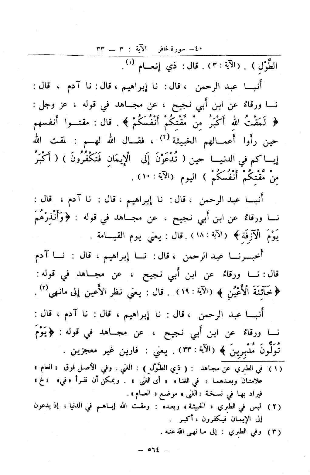 انبا عبد الرحمن قال نا إبراهيم قال نا آدم قال نا ورقاء عن ابن أبي نجيح عن مجاهد في قوله يوم تولون مدبرين يعني فارين غير معجزين