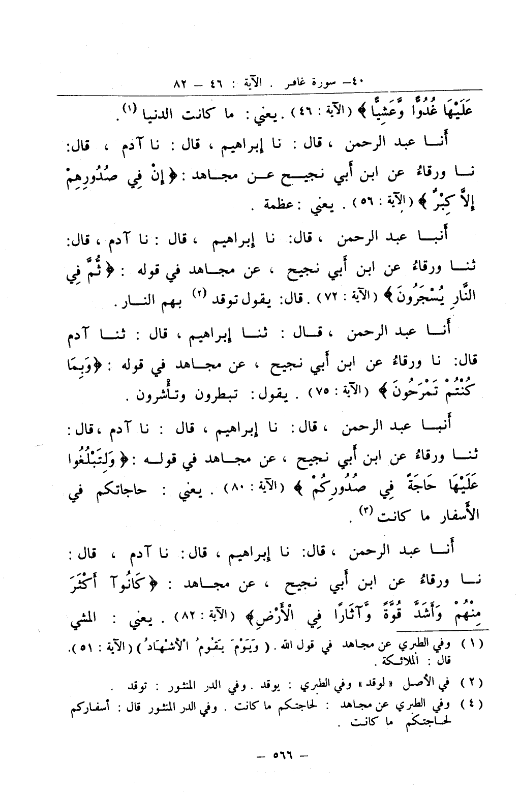 انبا عبد الرحمن قال نا إبراهيم قال نا آدم قال ثنا ورقاء عن ابن أبي نجيح عن مجاهد في قوله ثم في النار يسجرون قال يقول توقد بهم النار