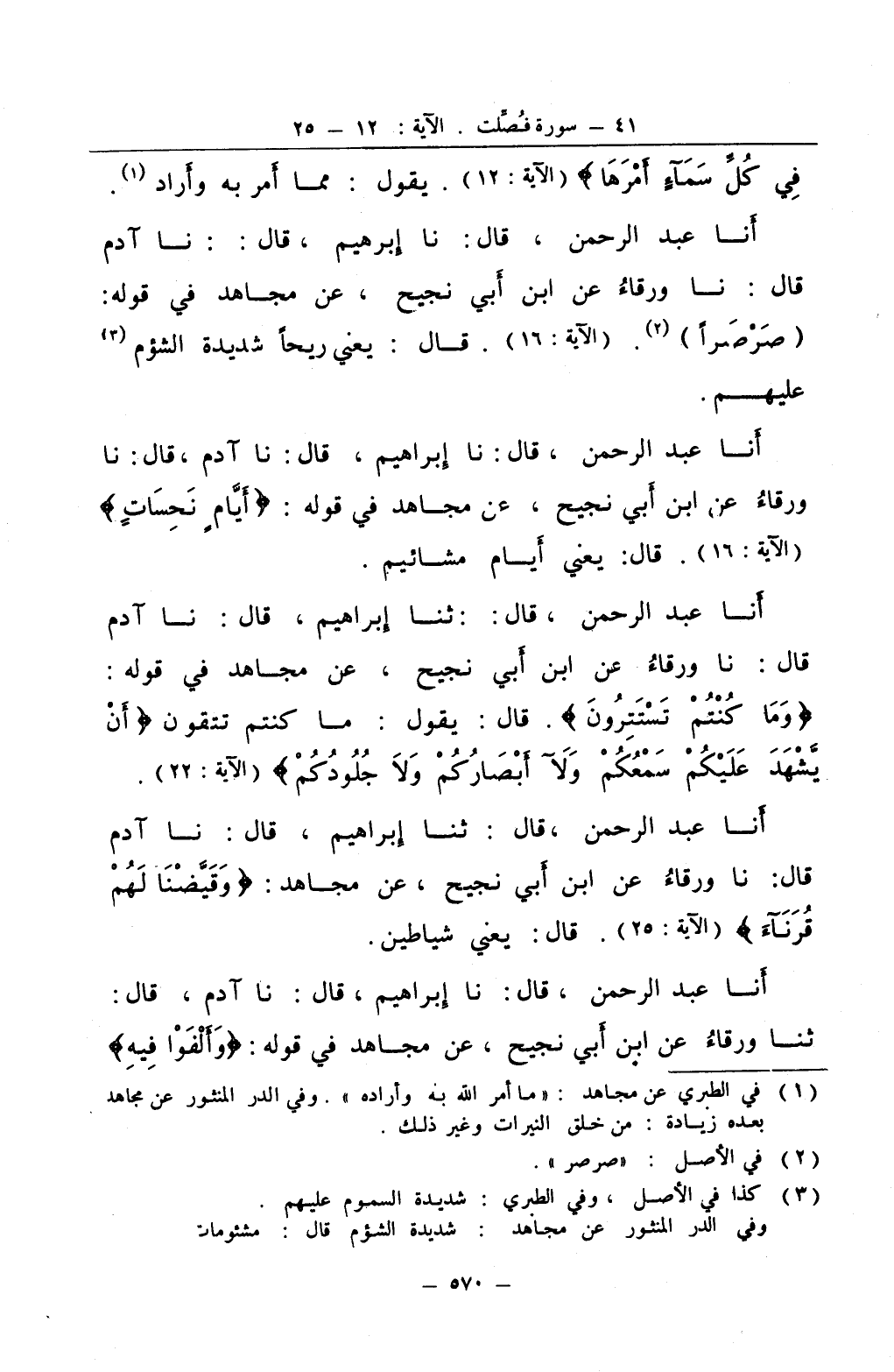 أنا عبد الرحمن قال ثنا إبراهيم قال نا آدم قال نا ورقاء عن ابن أبي نجيح عن مجاهد في قوله وما كنتم تستترون قال يقول ما كنتم تتقون أن يشهد عليكم سمعكم ولآ أبصاركم ولا جلودكم