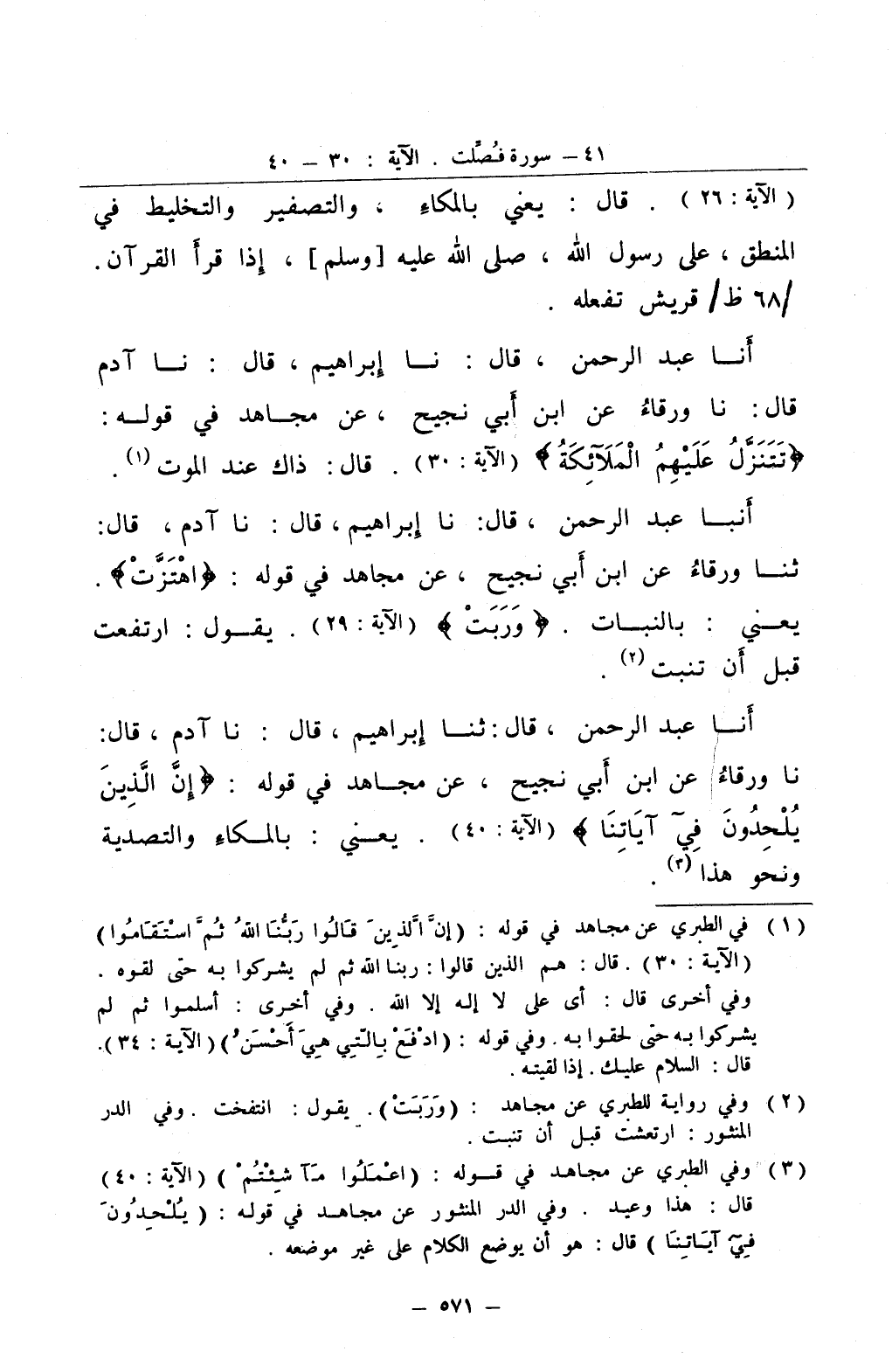 أنا عبد الرحمن قال ثنا إبراهيم قال نا آدم قال نا ورقاء عن ابن أبي نجيح عن مجاهد في قوله إن الذين يلحدون في آياتنا يعني بالمكاء والتصدية ونحو هذا