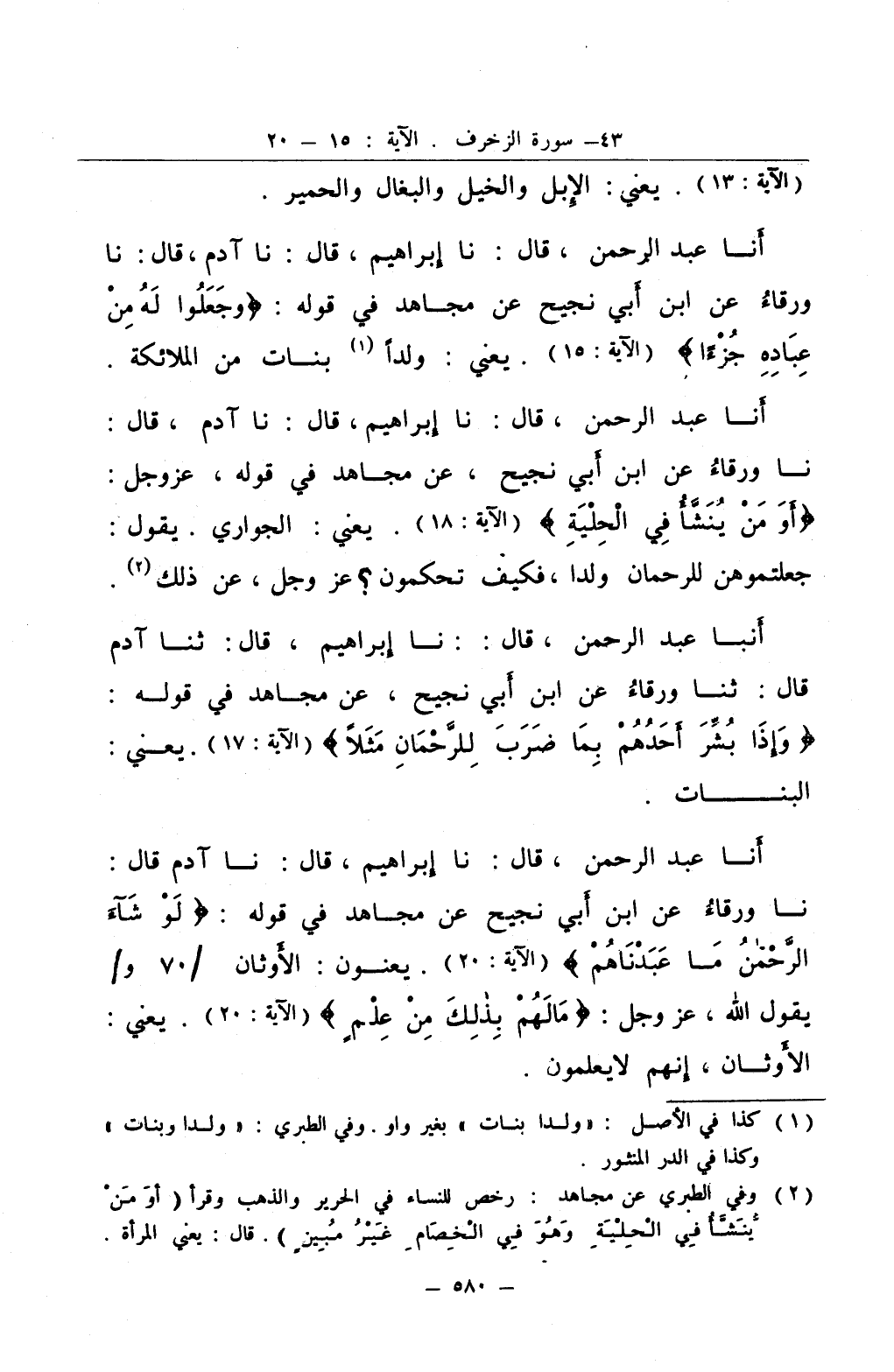 أنبا عبد الرحمن قال نا إبراهيم قال ثنا آدم قال ثنا ورقاء عن ابن أبي نجيح عن مجاهد في قوله وإذا بشر أحدهم بما ضرب للرحمان مثلا يعني البنات
