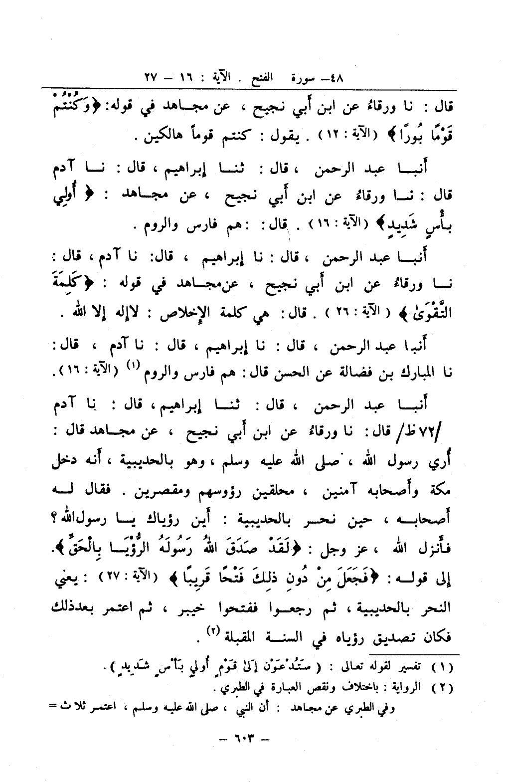 أنبا عبد الرحمن قال ثنا إبراهيم قال نا آدم قال نا ورقاء عن ابن أبي نجيح عن مجاهد قال أرى رسول الله صلى الله عليه و سلم وهو بالحديبية أنه دخل مكة وأصحابه آمنين محلقين رؤوسهم ومقصرين فقال له أصحابه حين نحر بالحديبية أين رؤياك يا رسول الله فأنزل الله عز و جل لقد صدق الله رسوله الرؤيا بالحق إلى قوله فجعل من دون ذلك فتحا قريبا يعني النحر بالحديبية ثم رجعوا ففتحوا خيبر ثم اعتمر بعد ذلك فكان تصديق رؤياه في السنة المقبلة