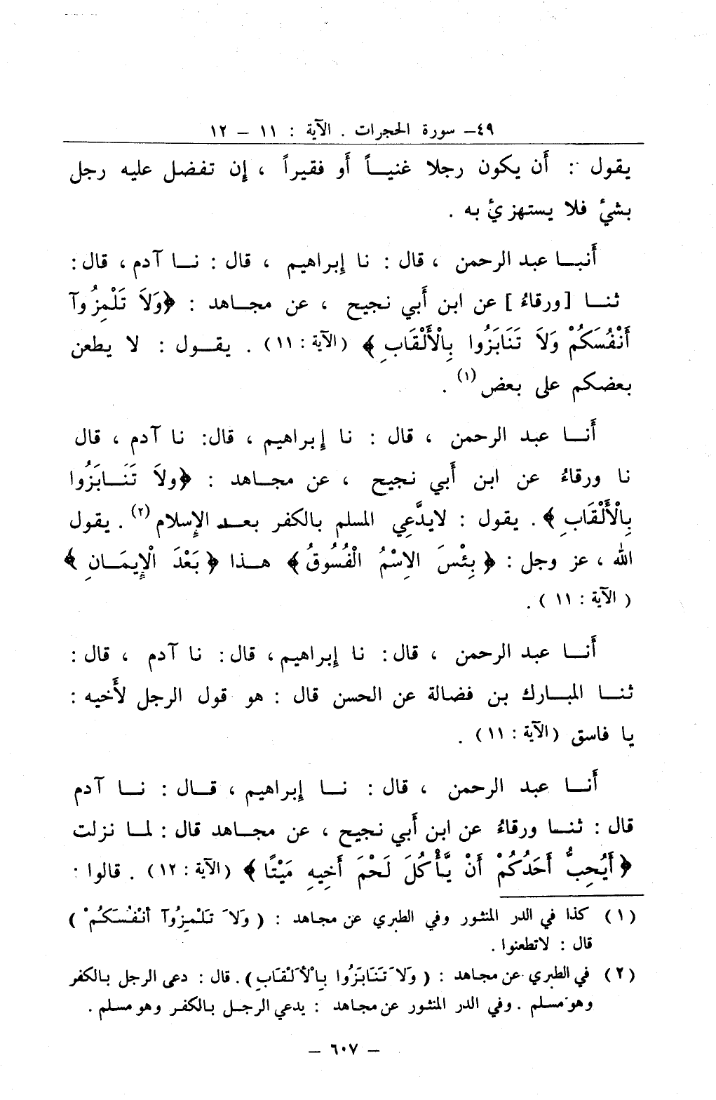 أنبا عبد الرحمن قال نا إبراهيم قال نا آدم قال ثنا ورقاء عن ابن أبي نجيح عن مجاهد ولا تلمزوآ أنفسكم ولا تنابزوا بالألقاب يقول لا يطعن بعضكم على بعض