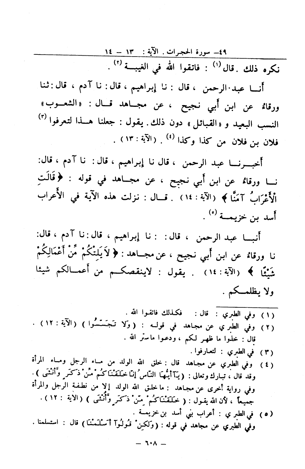 أنا عبد الرحمن قال نا إبراهيم قال نا آدم قال ثنا ورقاء عن ابن أبي نجيح عن مجاهد قال الشعوب النسب البعيد والقبائل دون ذلك يقول جعلنا هذا لتعرفوا فلان بن فلان من كذا وكذا