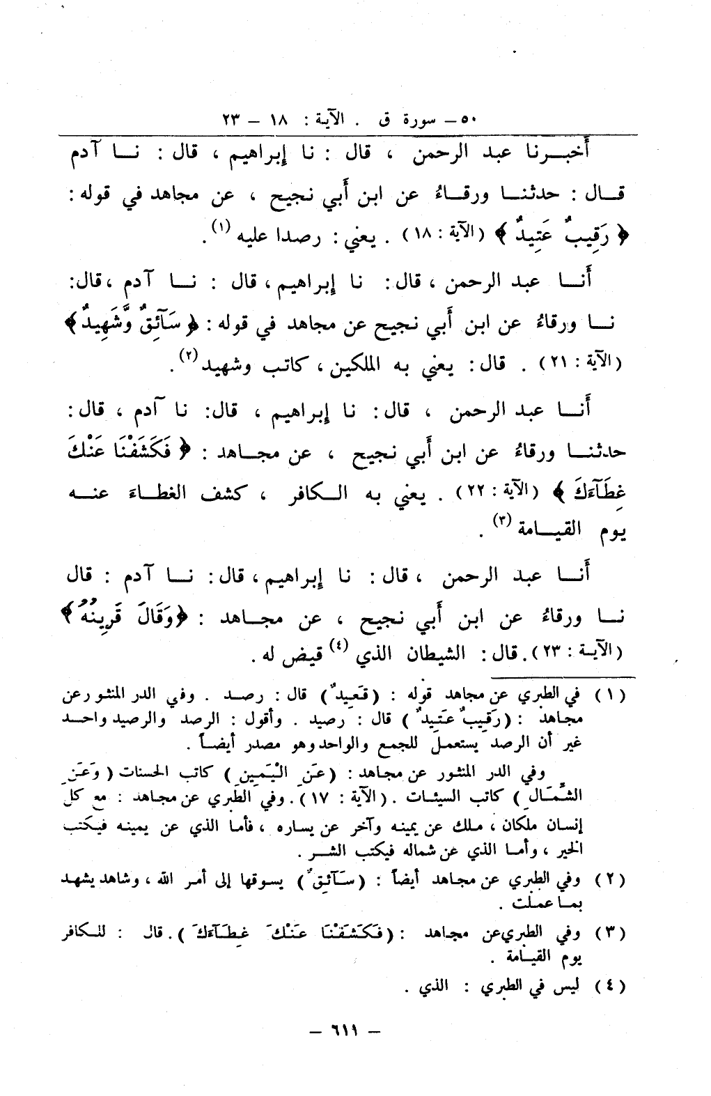 أخبرنا عبد الرحمن قال نا إبراهيم قال نا آدم قال حدثنا ورقاء عن ابن أبي نجيح عن مجاهد في قوله رقيب عتيد يعني رصدا عليه