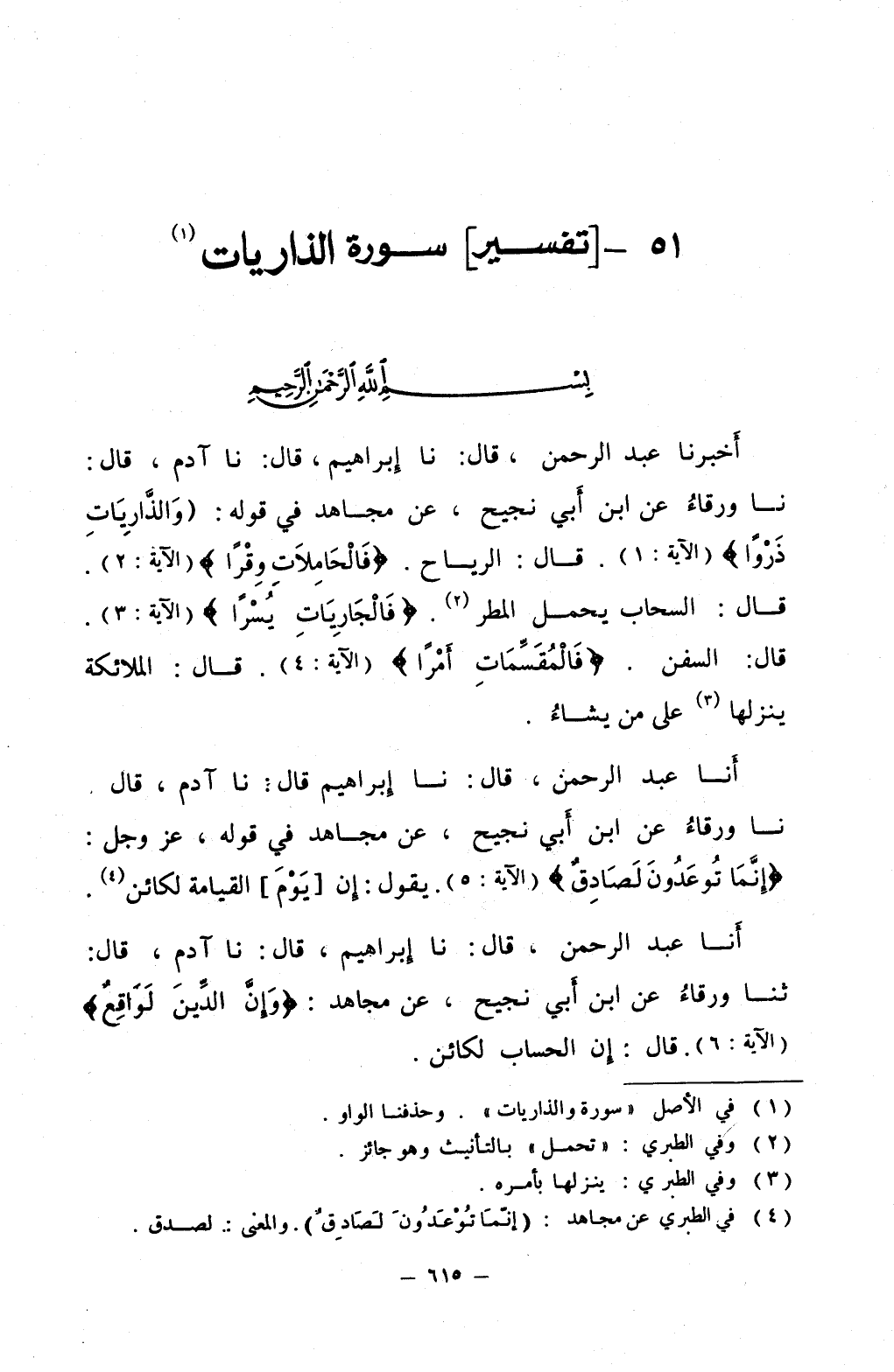 أخبرنا عبد الرحمن قال نا إبراهيم قال نا آدم قال نا ورقاء عن ابن أبي نجيح عن مجاهد في قوله والذاريات ذروا قال الرياح فالحاملات وقرا قال السحاب يحمل المطر فالجاريات يسرا قال السفن فالمقسمات أمرا قال الملائكة ينزلها على ما يشاء