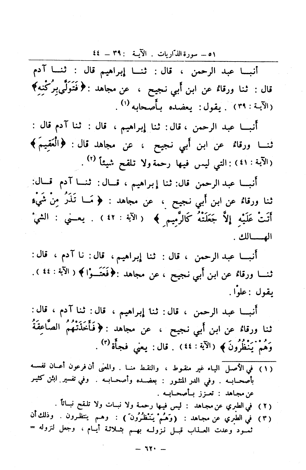 أنبا عبد الرحمن قال ثنا إبراهيم قال ثنا آدم قال ثنا ورقاء عن ابن أبي نجيح عن مجاهد فأخذتهم الصاعقة وهم ينظرون قال يعني فجأة