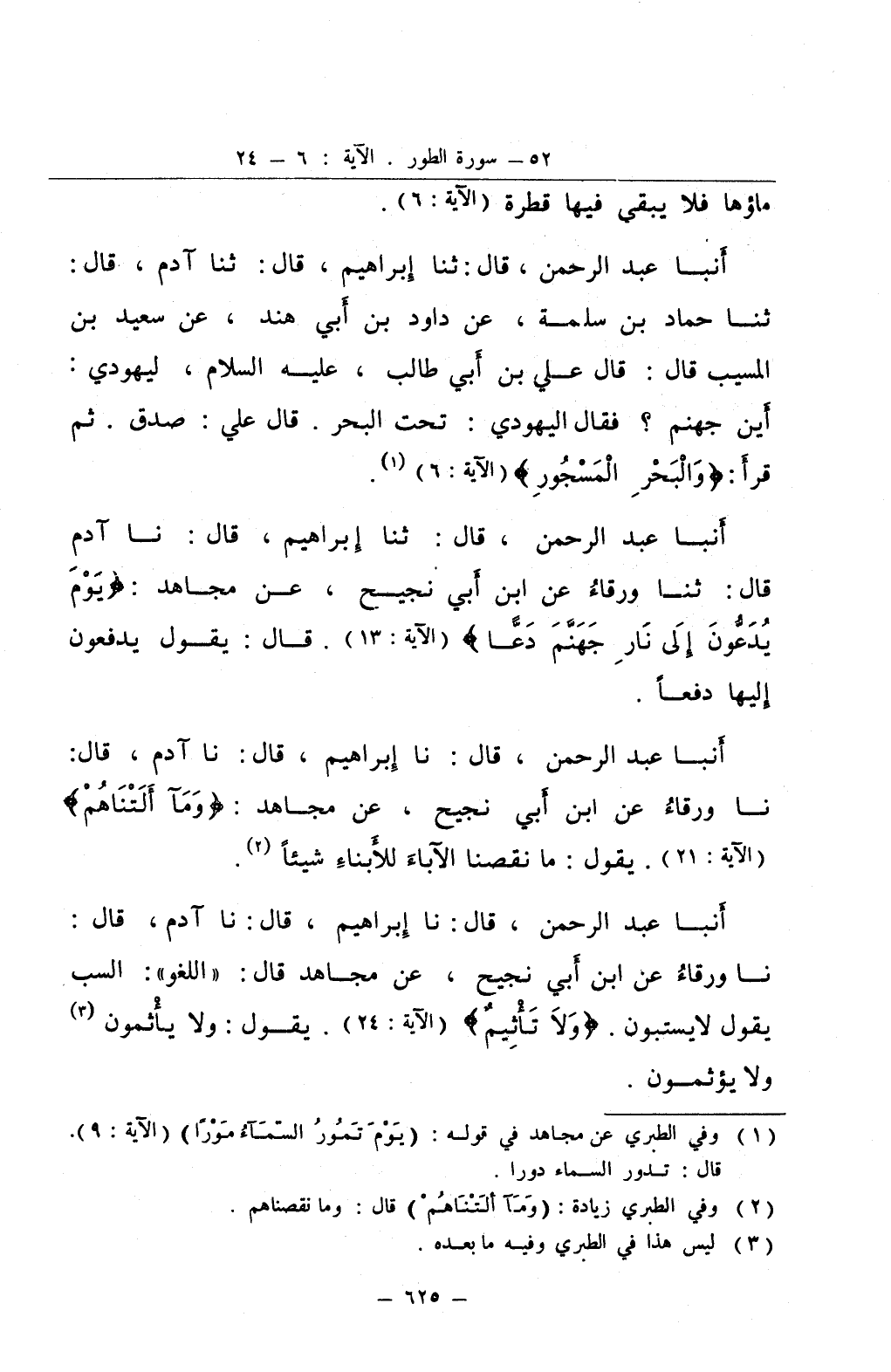 أنبا عبد الرحمن قال ثنا إبراهيم قال نا آدم قال ثنا ورقاء عن ابن أبي نجيح عن مجاهد يوم يدعون إلى نار جهنم دعا قال يقول يدفعون إليها دفعا