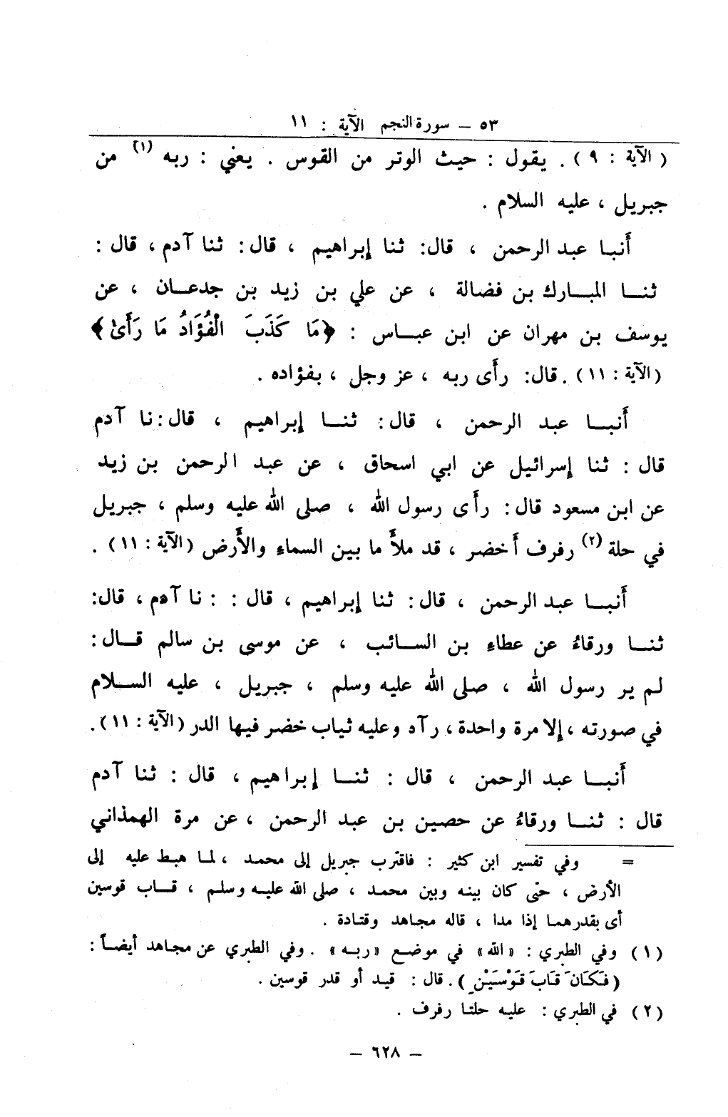 أنبا عبد الرحمن قال ثنا إبراهيم قال نا آدم قال ثنا إسرائيل عن أبي إسحاق عن عبد الرحمن بن زيد عن ابن مسعود قال رأى رسول الله صلى الله عليه و سلم جبريل في حلة رفرف أخضر قد ملأ ما بين السماء والأرض