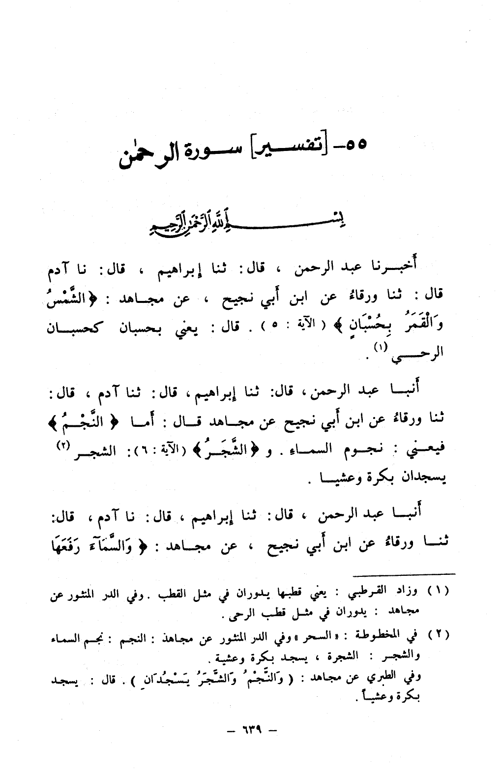 أنبا عبد الرحمن قال ثنا إبراهيم قال ثنا آدم قال ثنا ورقاء عن ابن أبي نجيح عن مجاهد قال أما النجم فيعني نجوم السماء و الشجر الشجر يسجدان بكرة وعشيا