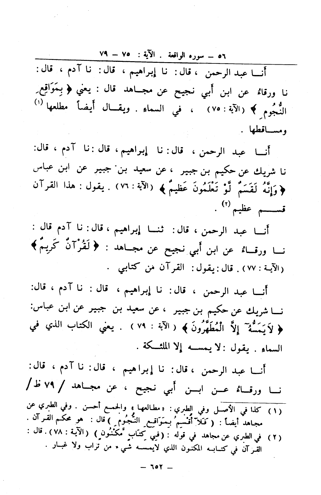 أنا عبد الرحمن قال نا إبراهيم قال نا آدم قال نا شريك عن حكيم بن جبير عن سعيد بن جبير عن ابن عباس لا يمسه إلا المطهرون يعني الكتاب الذي في السماء يقول لا يمسه إلا الملئكة