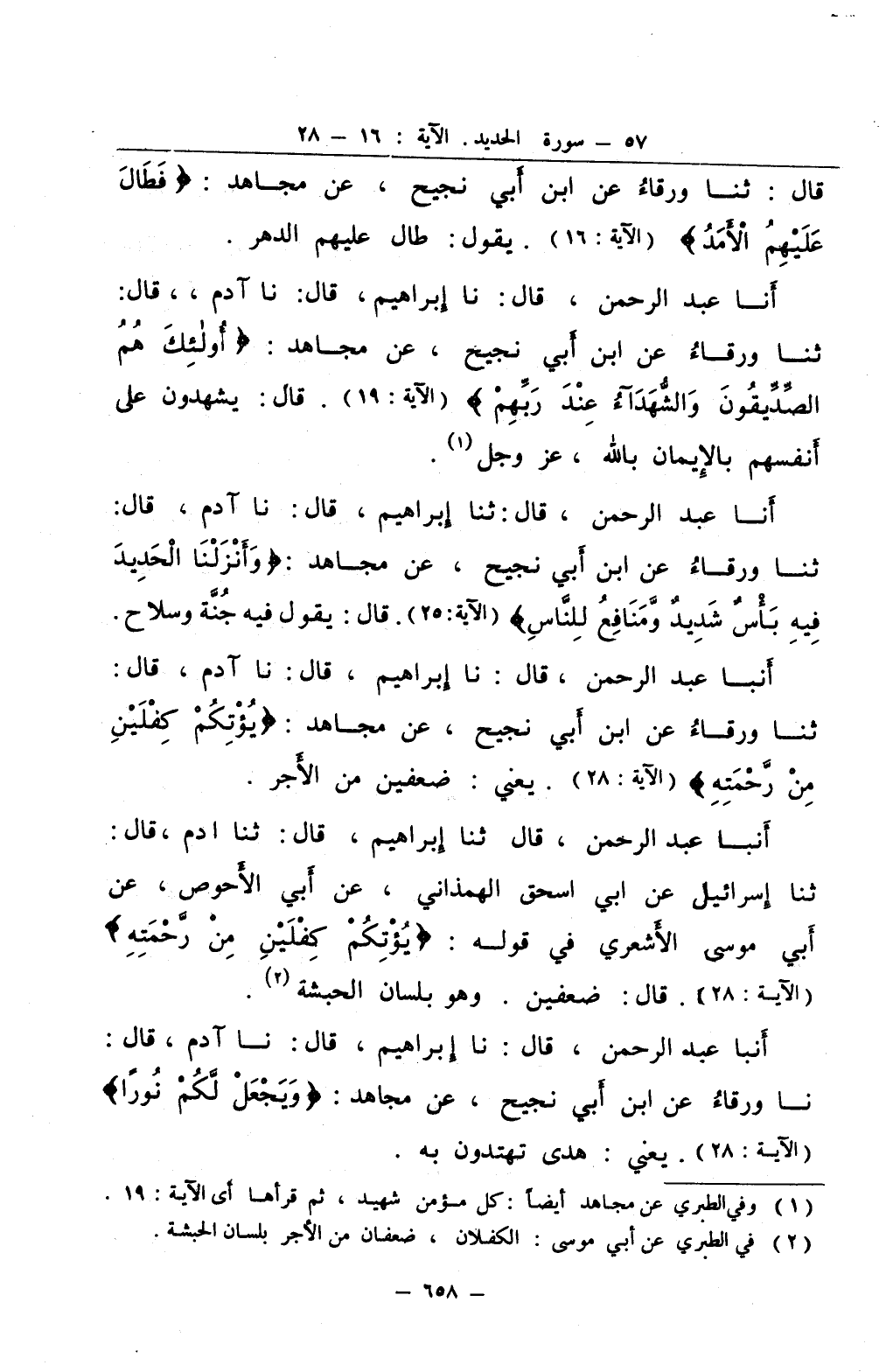 أنبا عبد الرحمن قال نا إبراهيم قال نا آدم قال ثنا ورقاء عن ابن أبي نجيح عن مجاهد يؤتكم كفلين من رحمته يعني ضعفين من الأجر