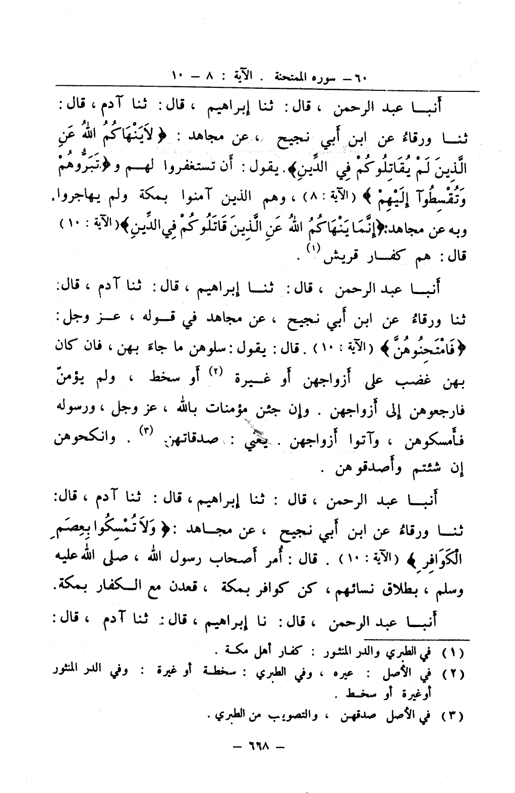 أنبا عبد الرحمن قال ثنا إبراهيم قال ثنا آدم قال ثنا ورقاء عن ابن أبي نجيح عن مجاهد لا ينهاكم الله عن الذين لم يقاتلوكم في الدين يقول أن تستغفروا لهم و تبروهم وتقسطوآ إليهم وهم الذين آمنوا بمكة ولم يهاجروا وبه عن مجاهد إنما ينهاكم الله عن الذين قاتلوكم في الدين قال هم كفار قريش